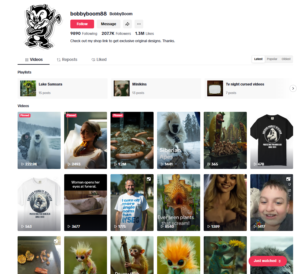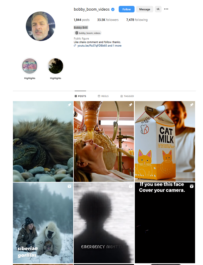 جولة في حسابات Bobby Boom، في انستغرام وتيك توك ويوتيوب، تبيّن بوضوح ان الفيديوات التي ينشرها خيالية ومولدة بالذكاء الاصطناعي.