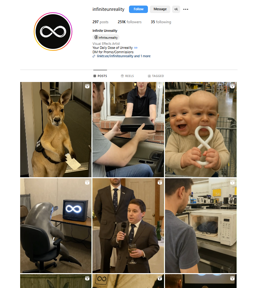 ومع ان Infinite Unreality لم يحدّد ماهية هذه المشاهد، الا ان التعريف به كان كافيا لندرك أننا أمام مشاهد غير حقيقية. فهو يقول إنه "فنان متخصص بالمؤثرات البصرية"، ويمكن الزوار ان يجدوا لديه "جرعتهم اليومية من الخيال". ويوقّع فيديواته برمز "اللانهاية"