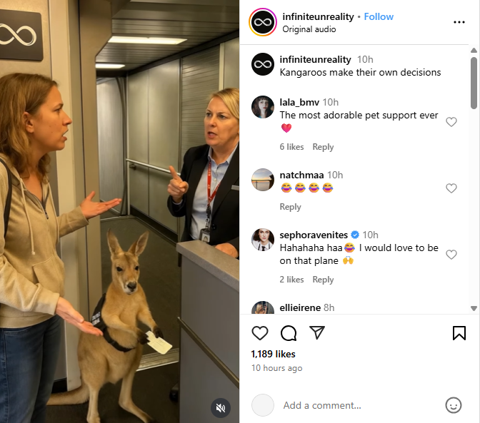 وكان من شأن كلمات مفاتيح بالانكليزية، مثل Infinity وKangaroo وPlane، ان توصلنا فورا الى حساب Infinite Unreality في انستغرام، والذي نشر المقطع في 25 ايار 2025، مع تعليق: No kangaroos on the plane، اي لا يُسمح بوجود الكنغر في الطائرة.