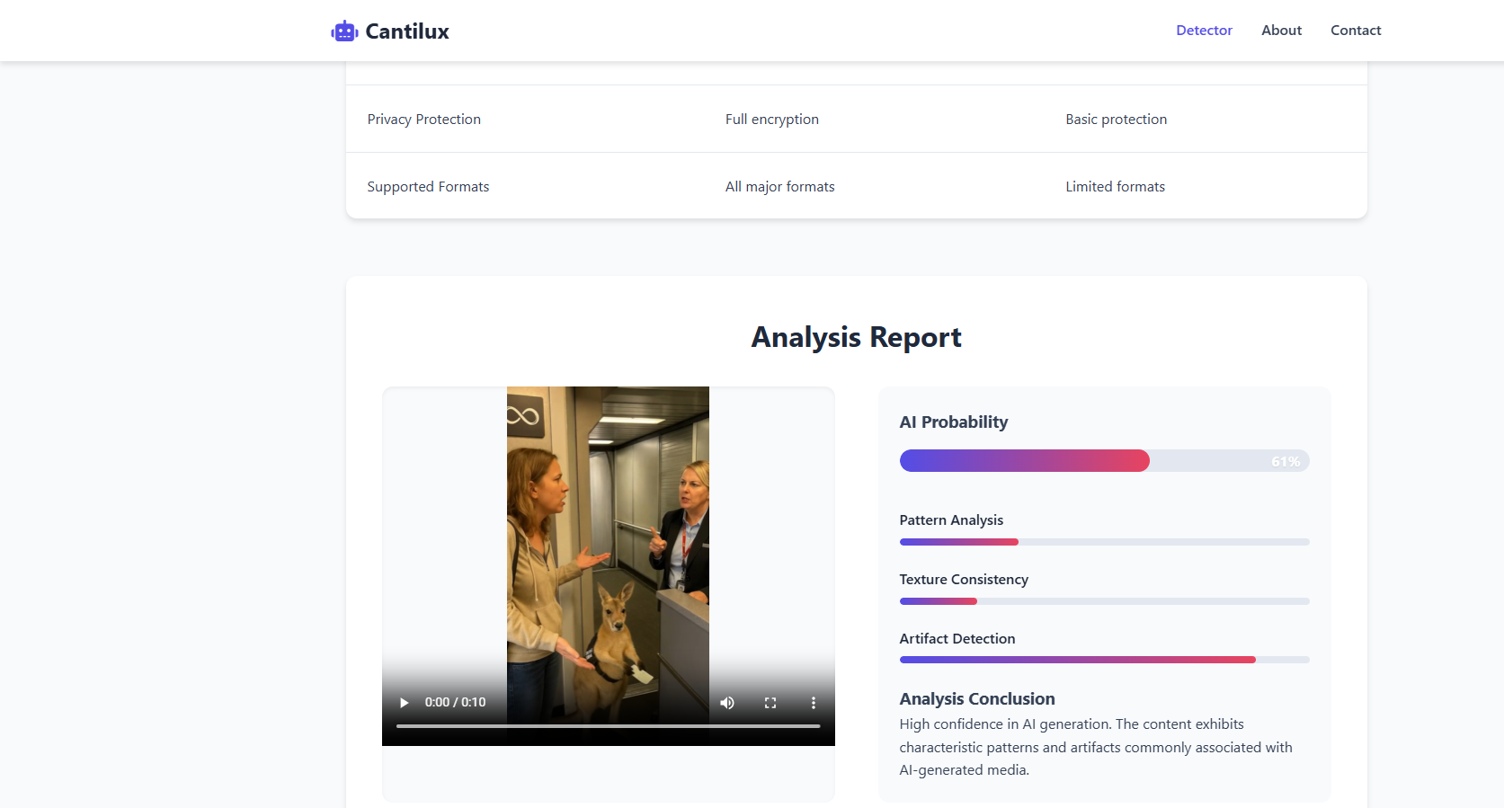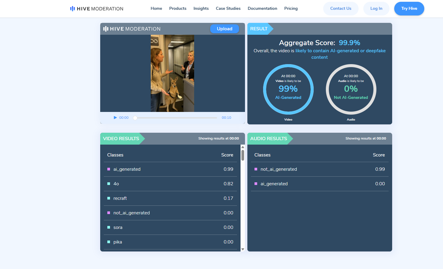 فحص المقطع في مواقع متخصصة بكشف الفيديوات الزائفة، مثل Hive Moderation وCantilux يعطي نتيجة انه يتضمن أنماطا وخصائص مرتبطة عادةً بالوسائط المُولّدة بالذكاء الاصطناعي.