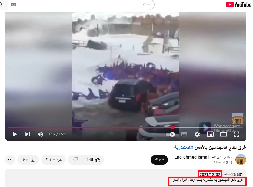 فقد تم نشره على إحدى القنوات في موقع يوتيوب في 2 كانون الأول (ديسمبر) 2021، بعنوان: "غرق نادي المهندسين بالإسكندرية بسبب ارتفاع أمواج البحر". ويظهر المقطع المتداول في الدقيقة 1:25.