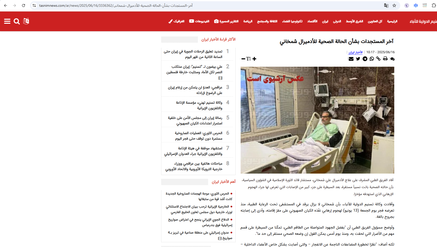 وفي وقت لم تذكر الوكالة اي تفاصيل عن الصورة، تناقلها مستخدمون بأنها تظهر "شمخاني في المستشفى، بعد نجاته من الهجوم الاسرائيلي على ايران"، الجمعة 13 حزيران 2025.