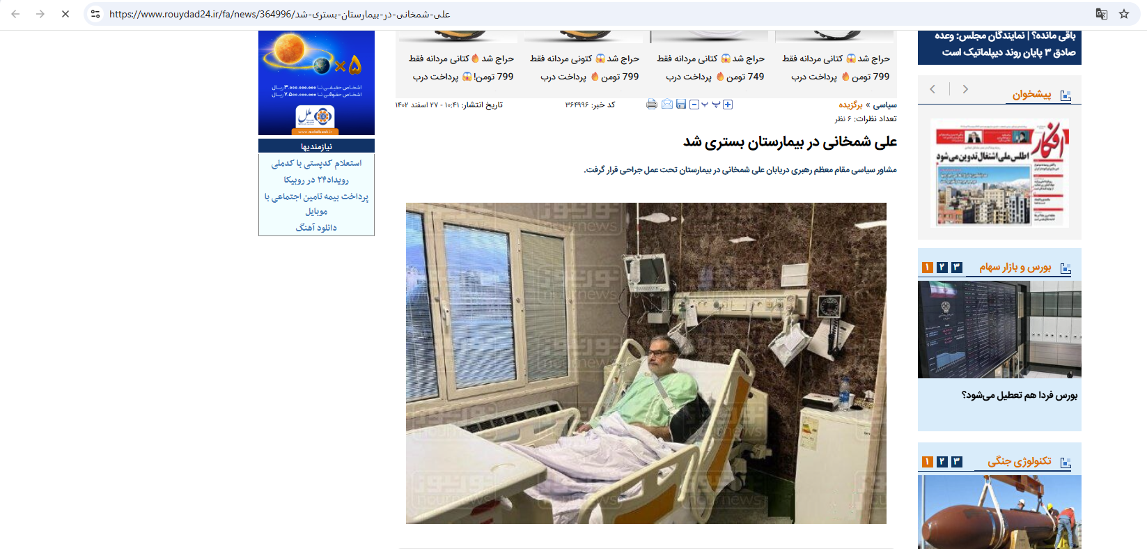 المتداول: صورة تظهر، وفقاً للمزاعم، علي شمخاني، مستشار المرشد الأعلى آية الله علي خامنئي، "على سرير مستشفى، عقب إصابته في الهجوم الاسرائيلي على ايران"، الجمعة 13 حزيران 2025.