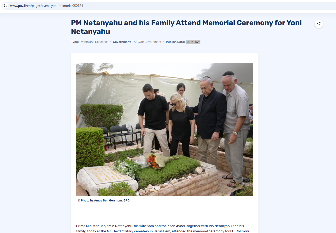 في الذكرى السنوية ليوناتان، يزور عادة بنيامين نتنياهو وزوجته مدفنه في المقبرة العسكرية في جبل هرتزل بالقدس، لوضع الزهور والصلاة. وقد عثرنا على صور مماثلة قديمة لهما امام المدفن، التُقطت خلال الاعوام الماضية، ومنشورة في حسابات نتنياهو ومكتب رئيس الوزراء الاسرائيلي.