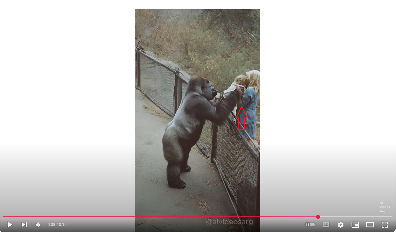 فالبحث عن المقطع، بتجزئته الى صور ثابتة (Invid)، وباستخدام كلمات مفاتيح بالانكليزية، مثل Gorilla وBaby وZoo، يوصلنا الى حساب AI Videos Arg في يوتيوب، والذي نشره في 29 حزيران 2025، بعنوان: Zoo Gorilla Gives Baby Back To Mother، اي غوريلا في حديقة حيوان تعيد طفلاً إلى أمه.