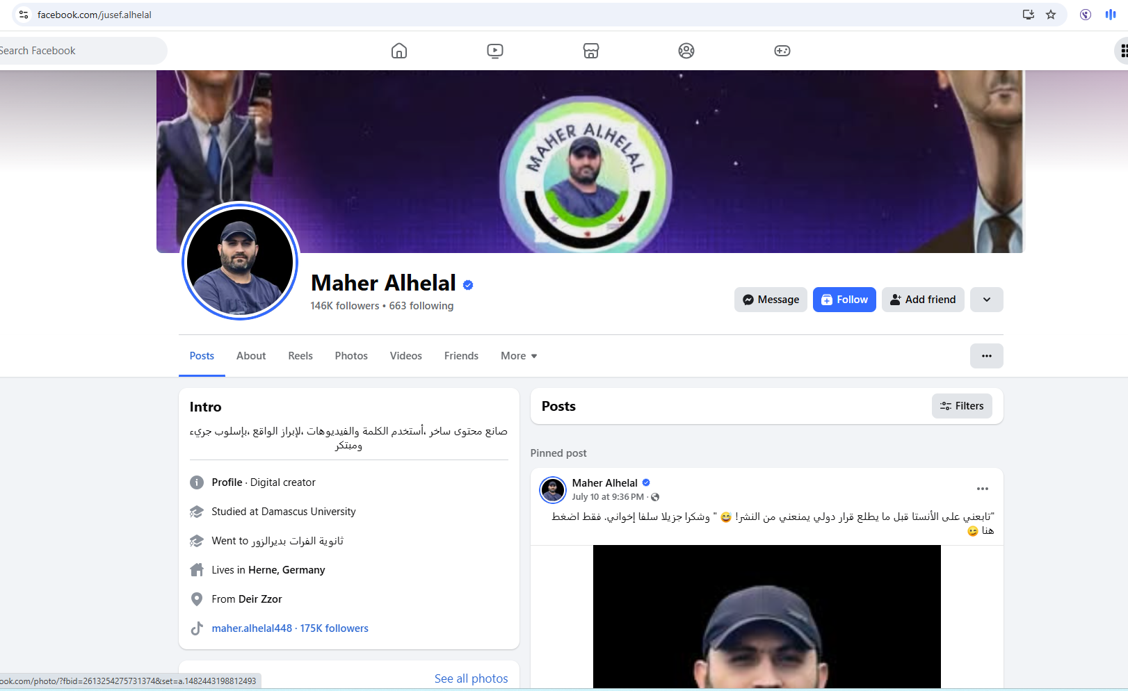 ويعرّف ماهر الهلال بنفسه انه "صانع محتوى ساخر أستخدم الكلمة والفيديوهات لإبراز الواقع بإسلوب جريء ومبتكر". ونشر خلال الساعات الماضية مقاطع زائفة أخرى للشيخ الهجري.