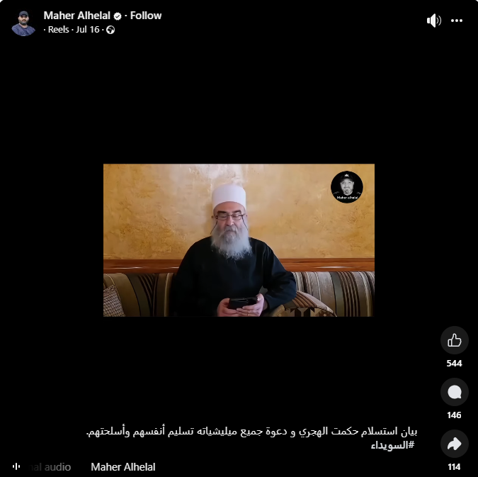 في الواقع، حمل الفيديو الزائف، في أعلاه الى اليمين، وجه رجل مع اسم Maher Alhelal (ماهر الهلال). كلمة مفتاح توصلنا الى صفحة بهذا الاسم في الفايسبوك نشرت الفيديو في 16 تموز 2025، بعنوان: "بيان استسلام حكمت الهجري ودعوة جميع ميليشياته لتسليم أنفسهم وأسلحتهم".