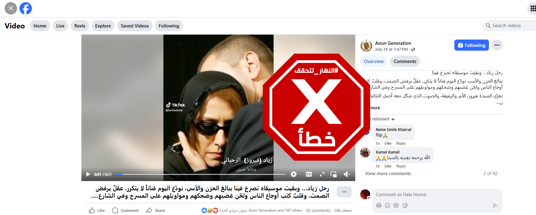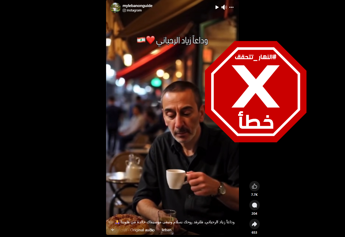 "وداعاً زياد". بهذا العنوان، تنتشر مجموعة فيديوات في وسائل التواصل الاجتماعي تظهر الفنان اللبناني زياد الرحباني عازفاً على البيانو بينما كان طفلاً، جالساً مع الاسرة الصغيرة، بينما جمعته لقطات بوالدته السيدة فيروز عند البيانو، مستغرقاً في العزف تحت أنظارها. وبينما بدا معانقاً اياها في مقطع، ظهر في آخر وهو يرتشف القهوة. الا انه حذار، هذه المشاهد المتحرّكة من صنيعة الذكاء الاصطناعي. FactCheck#