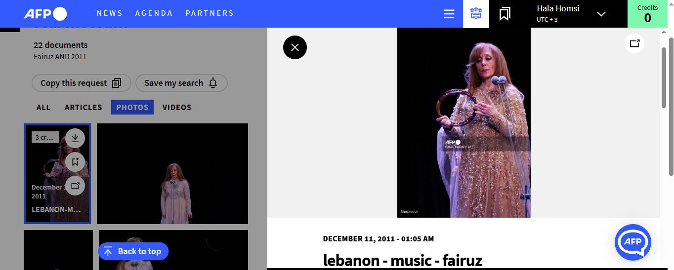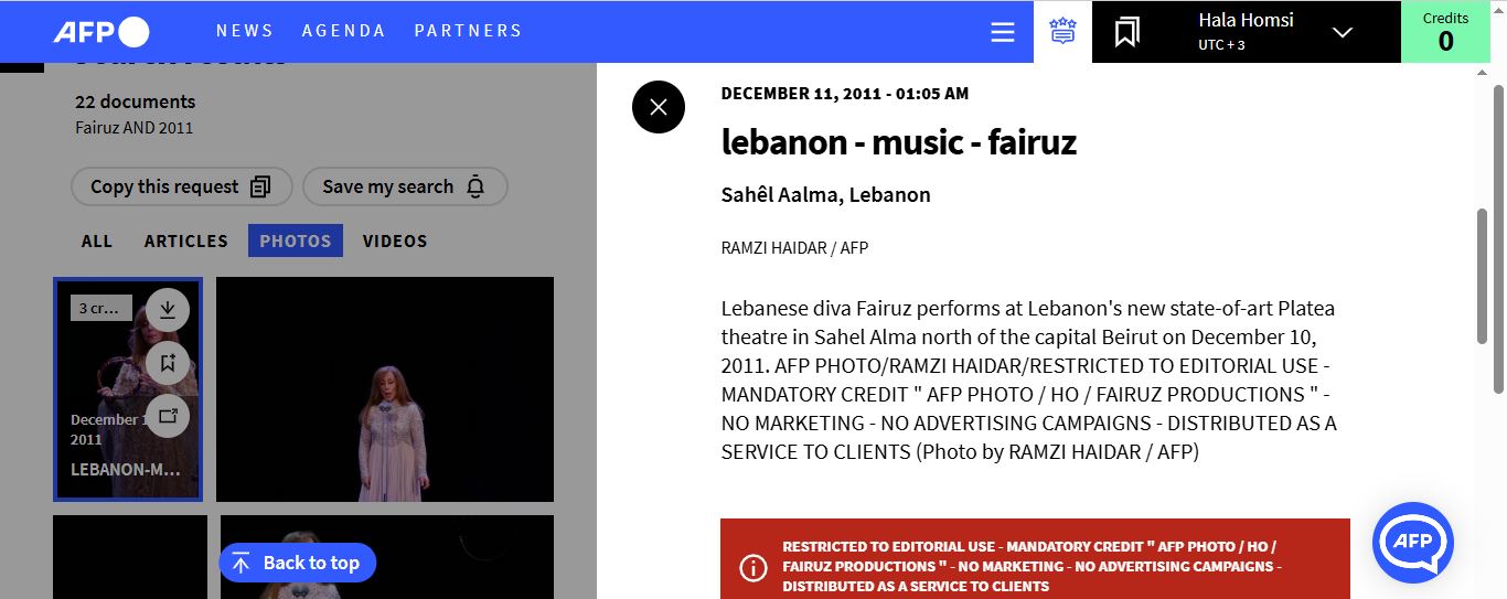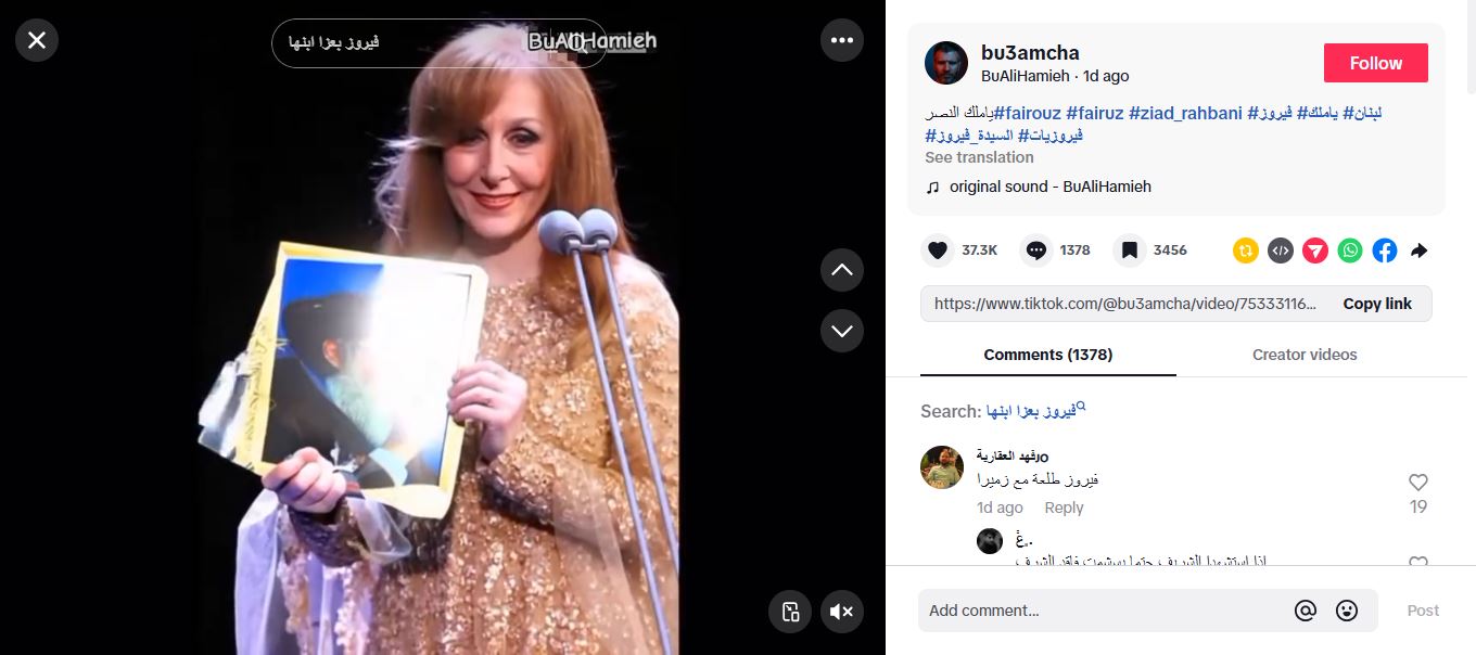 وفي مقطع فيروز ونصرالله، استخدم bu3amcha@ على ما يبدو صورة ثابتة أصلية، توصلنا اليها، عبر خيوط، مؤرشفة في موقع وكالة "فرانس برس"، مع شرح انها تظهر "المطربة اللبنانية فيروز خلال احيائها حفلة موسيقية على مسرح بلاتيا في ساحل علما شمال العاصمة بيروت، في 10 كانون الاول 2011".