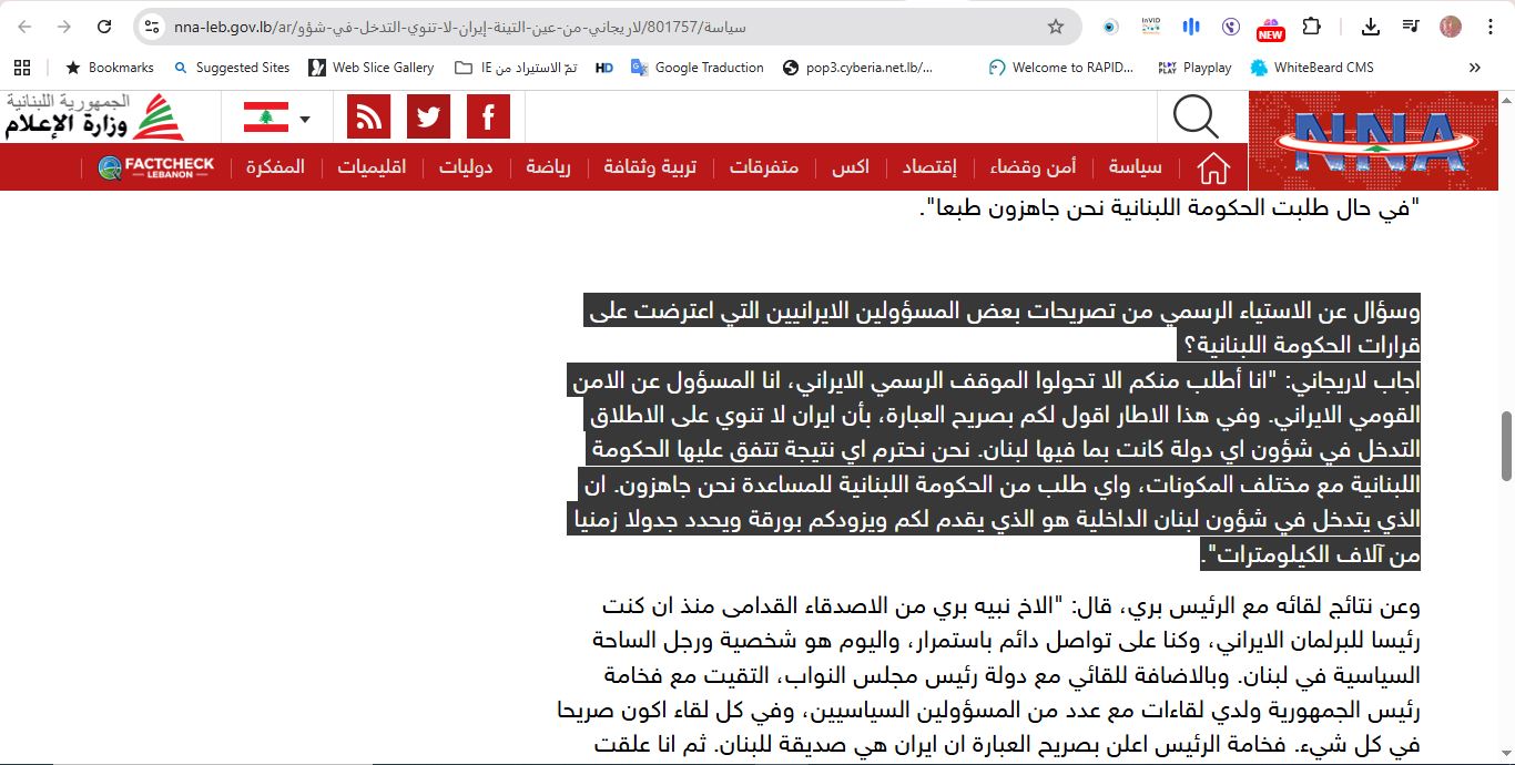 مقطع قيد التداول لتصريحات علي لاريجاني عقب لقائه الرئيس نبيه بري أمس. وقد أُرفق بترجمة الى العربية دقّقت "النهار" في صحّتها.