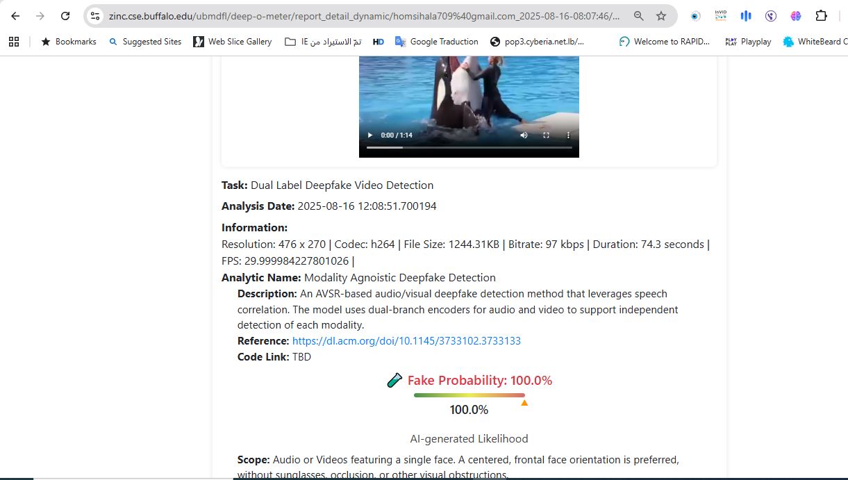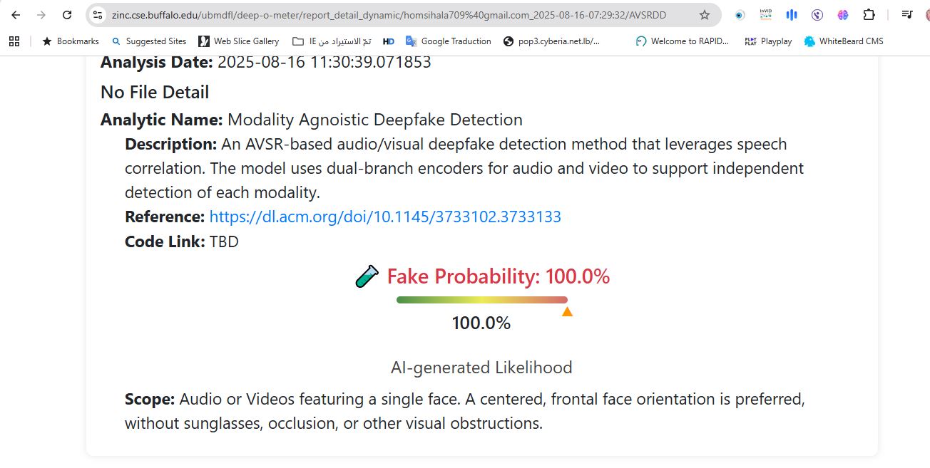 وجاءت نتيجة فحص الفيديو في أداة DeepFake-O-meter انه منشأ على الارجح بالذكاء الاصطناعي بنسبة 100%.