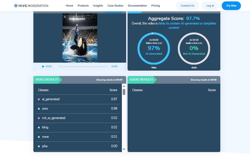 وجاءت نتيجة فحص الفيديو في مواقع متخصصة بكشف الفيديوات الزائفة، مثل Hive Moderation، ان الفيديو منشأ على الارجح بالذكاء الاصطناعي بنسبة 97%.