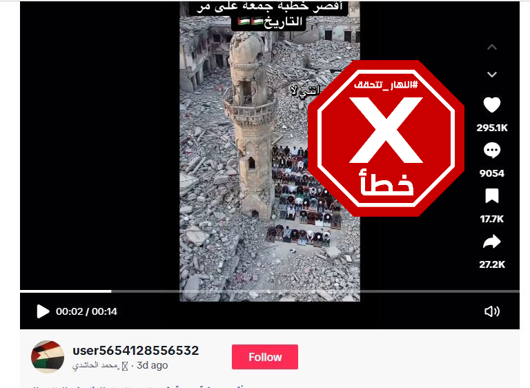 يوصلنا البحث الى نسخة منه منشورة في تيك توك في 14 آب 2025، في حساب ينشر مقاطع مولدة بالذكاء الاصطناعي، دعماً لغزة. ويُسمع فيها صوت مؤذن باك. وهذا يعني، اذاً، ان صوت الخطيب الذي يشكو من الجوع مركّب على المقطع، في شكل مضلل.