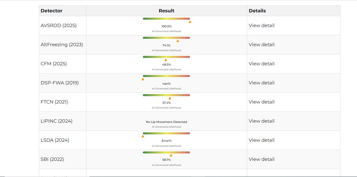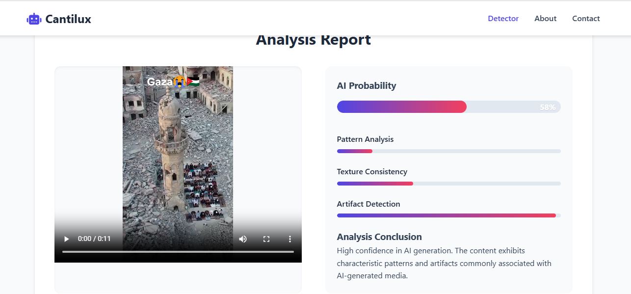 وتبين نتيجة فحص الفيديو في مواقع متخصصة بكشف الفيديوات الزائفة مثل Cantilux وDeepfake O meter، انه منشأ على الارجح بالذكاء الاصطناعي.