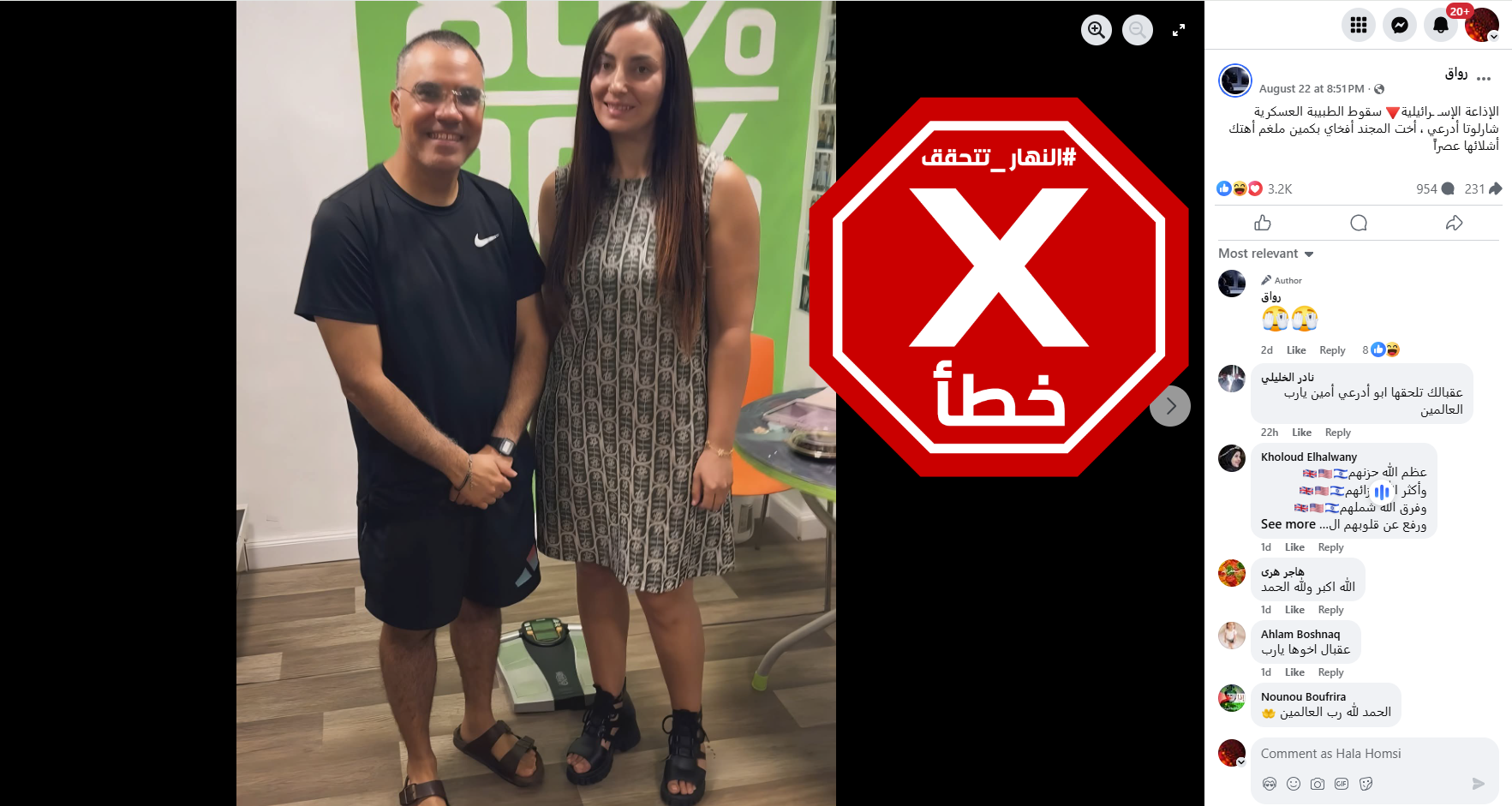 تقييمنا النهائي: اذاً، ليس صحيحاً ان الصورة تظهر "المتحدث باسم الجيش الاسرائيلي للاعلام العربي أفيخاي أدرعي مع شقيقته الطبيبة العسكرية شارلوتا أدرعي التي قتلت أخيراً في كمين". في الحقيقة، تظهر الصورة افيخاي ادرعي مع أماني حلبي، من مجدل شمس في الجولان المحتل. وقد نشرتها حلبي في صفحتها في الفايسبوك في 15 آب 2025.
