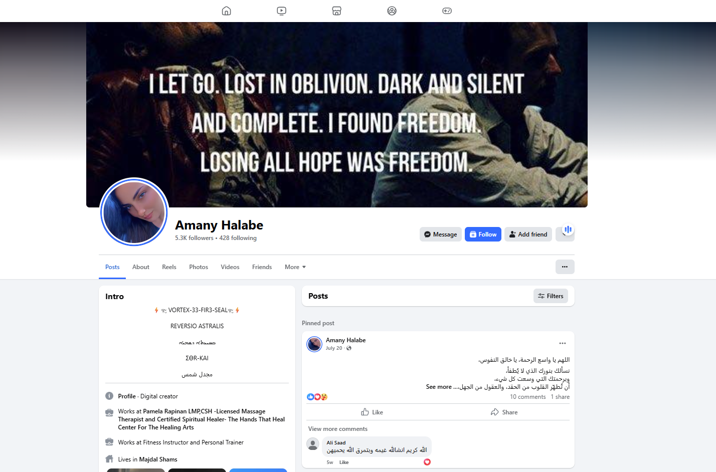 وكتبت في قسم التعريف أن مهنتها "مدربة لياقة بدنية ومدربة شخصية"، وهي من مجدل شمس في الجولان المحتل. وتعمل بعيادة للطب البديل.