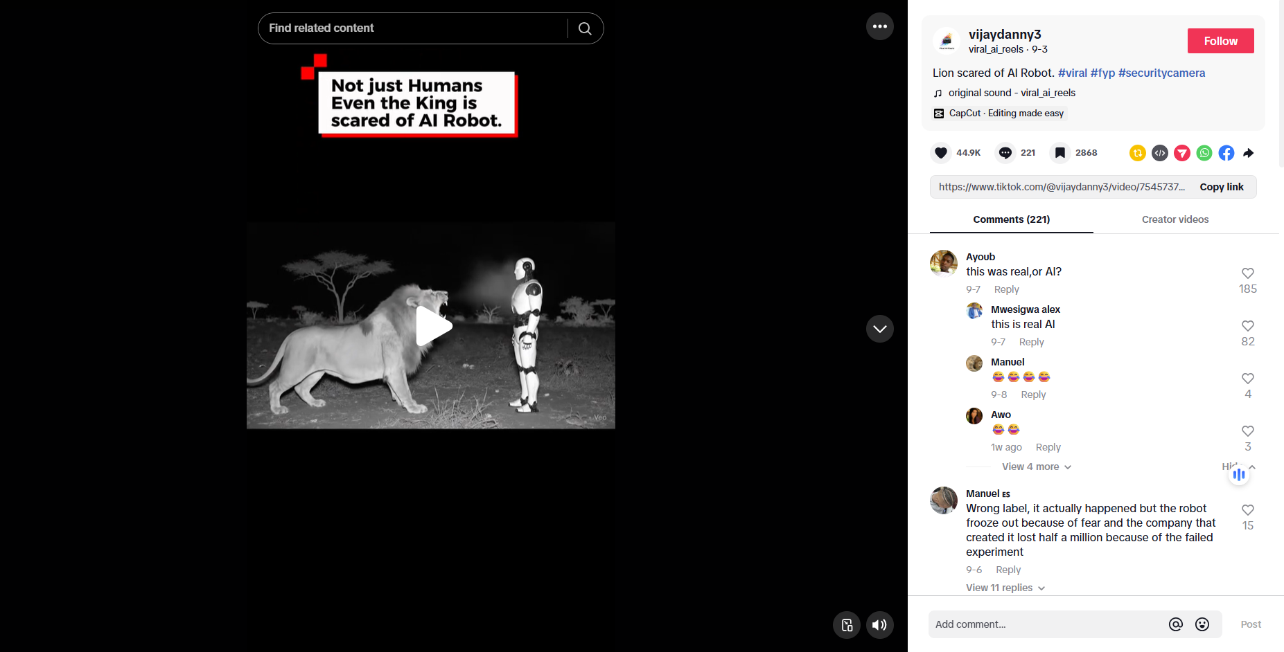 فالبحث العكسي عن الصورة يوصلنا اليها ضمن فيديو نشره حساب vijaydanny3/ viral_ai_reels@ في تيك توك، في 3 ايلول 2025، مع تعليق: Lion scared of AI Robot، اي اسد خائف من روبوت يعمل بواسطة الذكاء الاصطناعي. وكُتب على الفيديو: ليس البشر فحسب، حتى الملك يخاف من روبوتات الذكاء الاصطناعي.