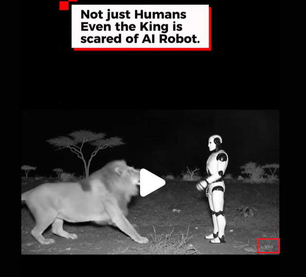 8 ثوان فقط، وحمل الفيديو في أسفله الى اليمين شعار VEO، نموذج تحويل النصوص فيديوات مع دمج صوتي من تطوير غوغل ديب ماين. وهذا يعني أن فيديو الاسد والروبوت مولد بالذكاء الاصطناعي.