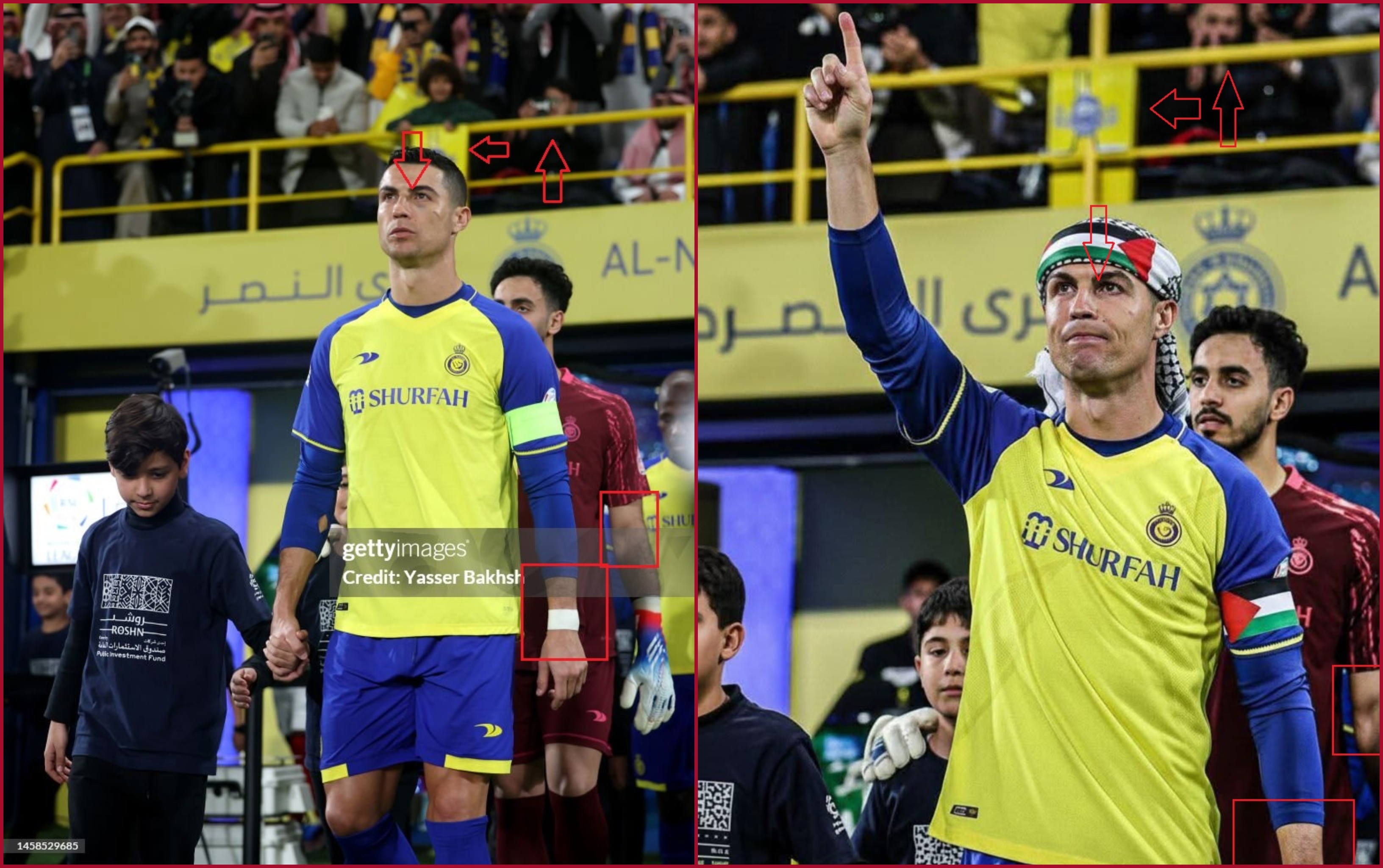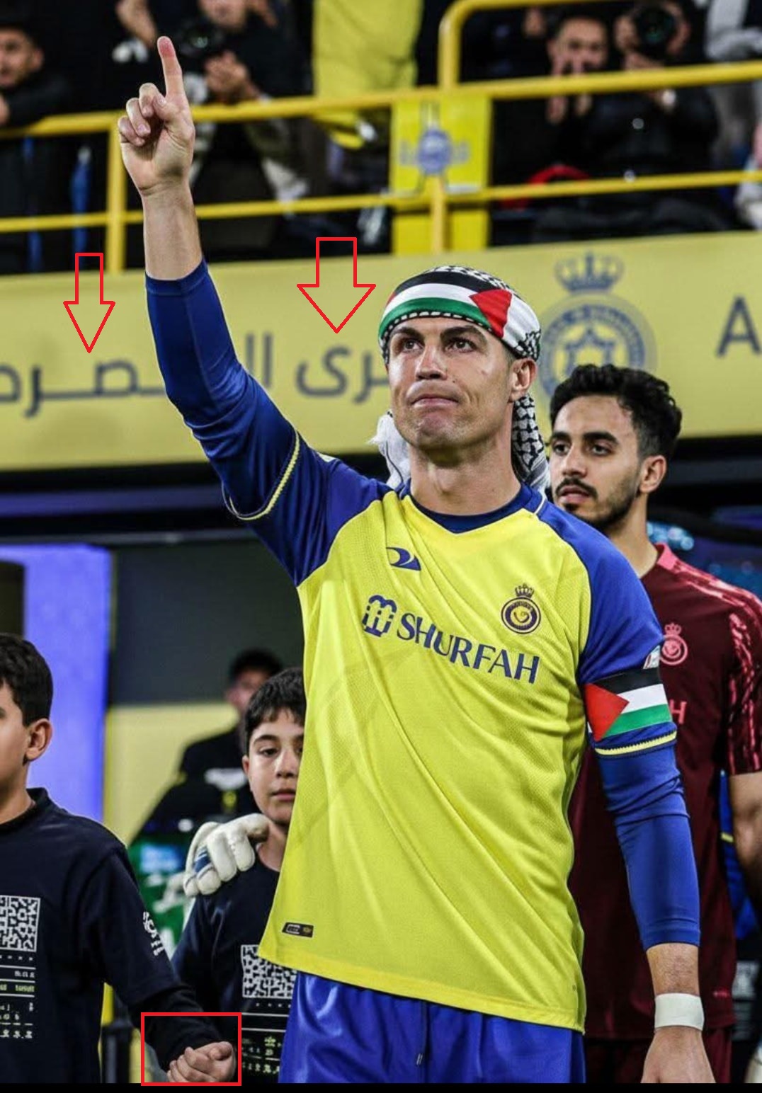 تظهر الصورة رونالدو واضعاً على رأسه كوفية فلسطينية مزدانة بالعلم الفلسطيني، بينما رفع يده عاليا في ملعب. وقد تكثّف التشارك فيها خلال الساعات الماضية في حسابات كتبت معها (من دون تدخل): "كريستيانو يفاجئ الجميع"، وايضا "كريستيانو رونالدو كم انت كبير".
