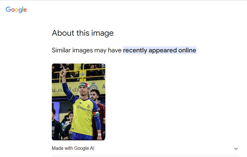 الى ذلك، تضمّنت الصورة المتناقلة مؤشرات الى الذكاء الاصطناعي، منها عبارات غير مفهومة على اللافتة الصفراء خلف رونالدو، علماً انها كانت واضحة في الصورة الاصلية (نادي النصر)، وتشوّه اليد اليسرى للفتى الواقف بجانب رونالدو.