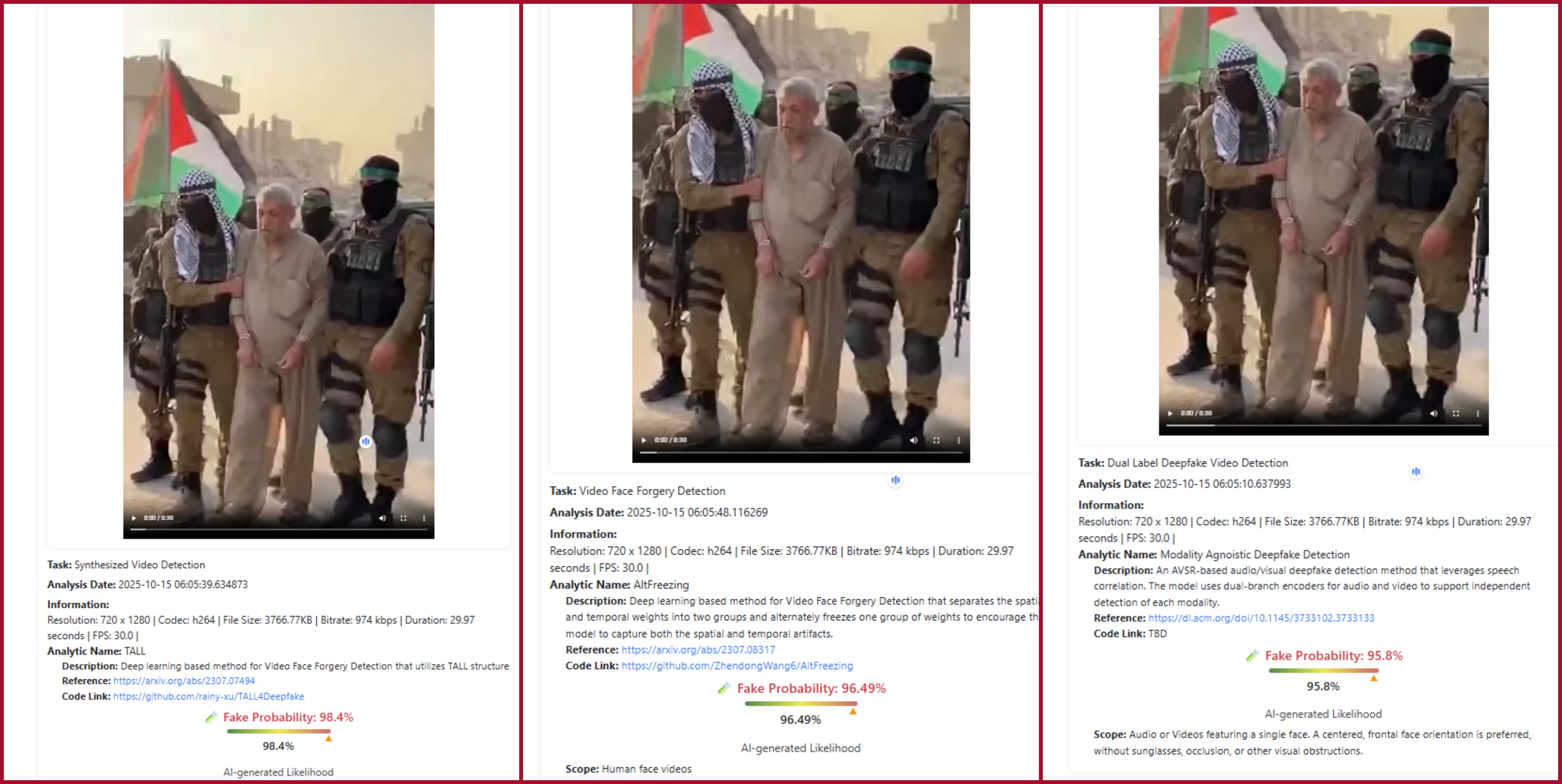 وتدعم هذا الاستنتاج نتيجة فحص الفيديو بواسطة برنامج DeepFake-O-Meter لكشف التزييف، والذي تؤمنه جامعة بافالو. وجاءت انه مولد على الارجح بالذكاء الاصطناعي. وحددت اداة اكتشاف الفيديوات الزائفة ذات العلامة المزدوجة نسبة التزييف فيه بـ95.8%، وأداة كشف تزوير الوجه في الفيديو بـ96.49%، وأداة كشف الفيديو المركب بـ98.4%.