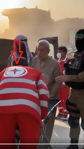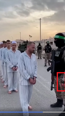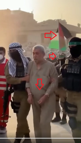 *القيود في يدي الرجل الذي كان عناصر من حماس يقتادونه، بدت من دون سلسلة (التوقيت 0.02). وماذا عن عنصر القسام خلفه بوجه اخترقه طرف عصا؟ (الصورة 1).