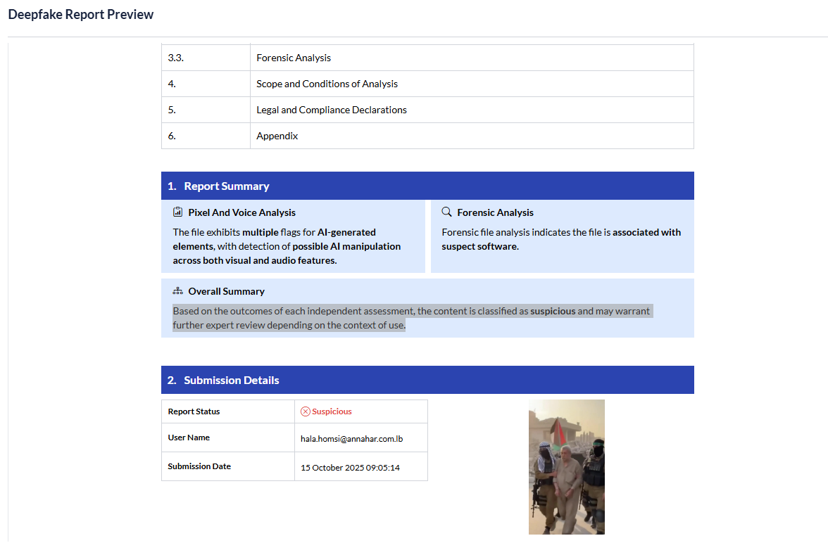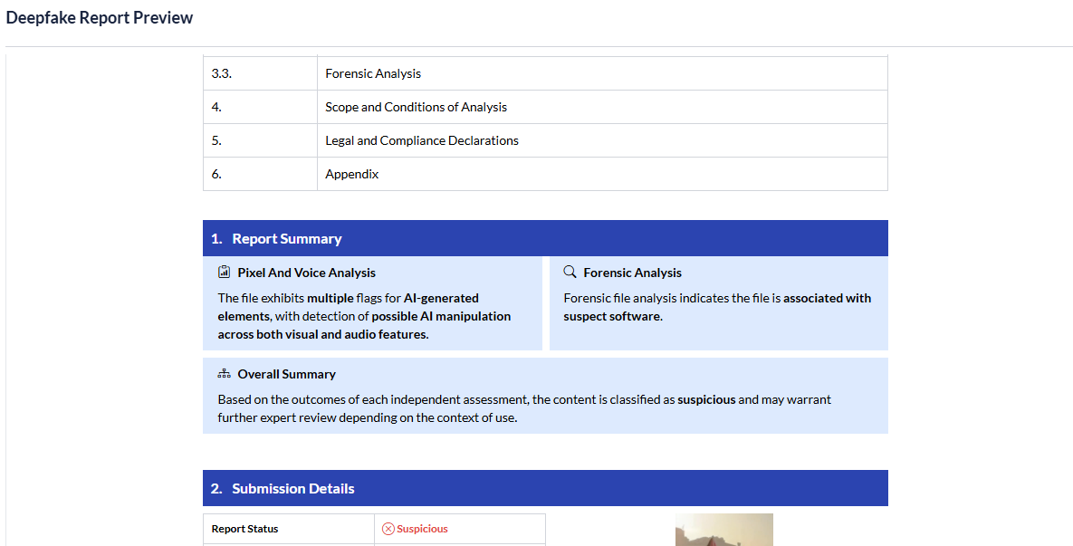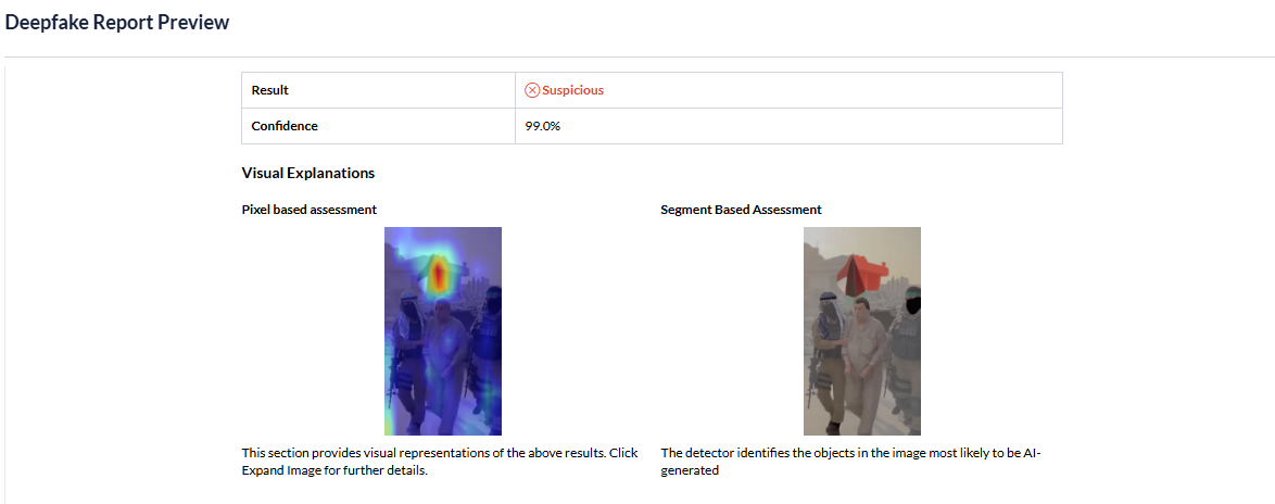 كذلك، توصل برنامج Sensity.ai الى ان المقطع مشبوه. ففي تحليله البكسل والصوت، تبين ان الفيديو تضمن علامات متعددة لعناصر تم إنشاؤها بواسطة الذكاء الاصطناعي، مع كشف وجود تلاعب محتمل بالذكاء الاصطناعي عبر الميزات المرئية والصوتية. وتوصل التحليل الشرعي إلى أن الفيديو مرتبط ببرنامج مشبوه.