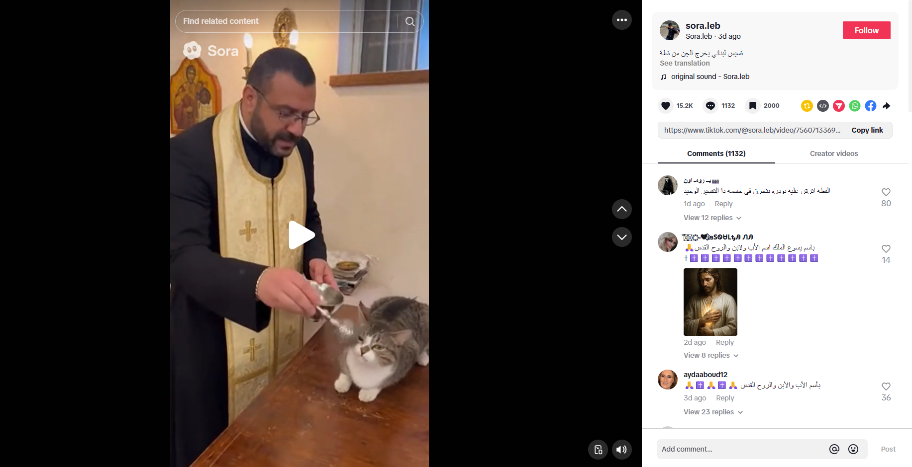 مزيد من البحث يوصلنا الى مصدر الفيديو، حساب sora.leb في تيك توك، والذي نشره في 13 تشرين الاول 2025، مع تعليق: قسيس لبناني يخرج الجن من قطة.