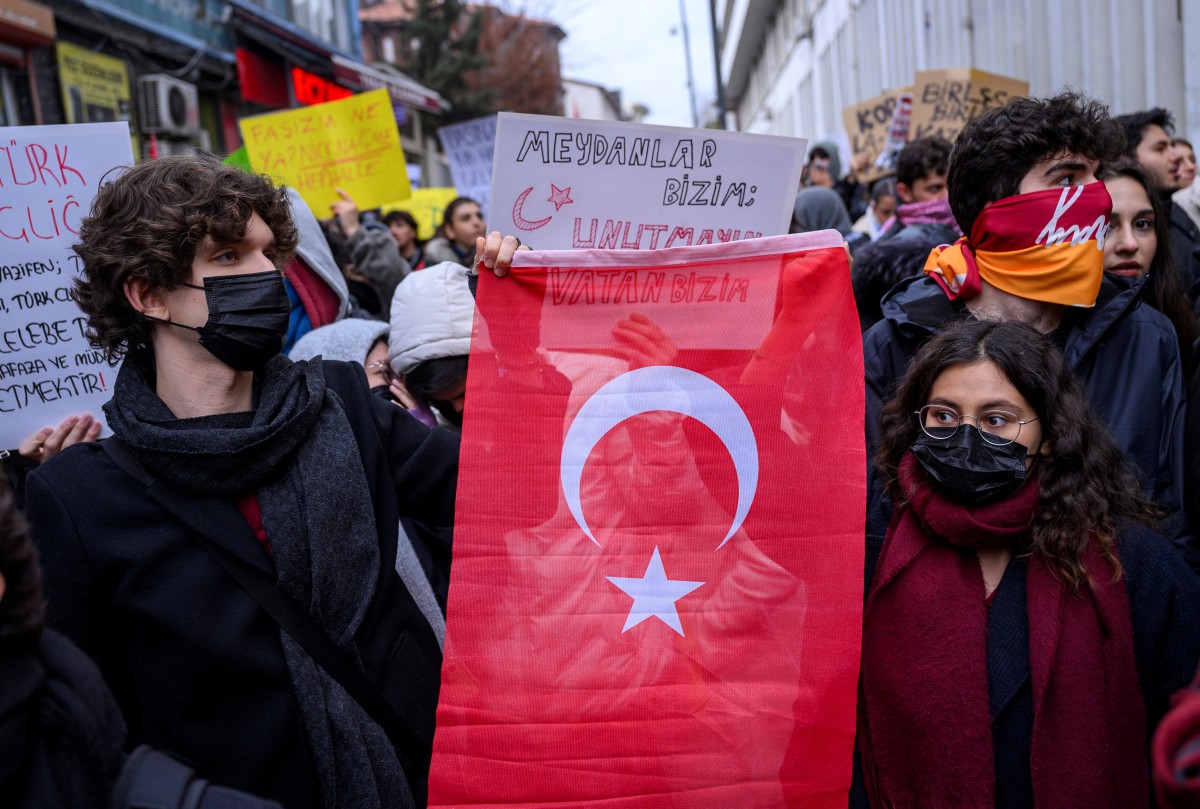طلاب جامعيون يرفعون العلم الوطني التركي أثناء مسيرتهم نحو بلدية إسطنبول في سراي هانة في إسطنبول. (أ ف ب)