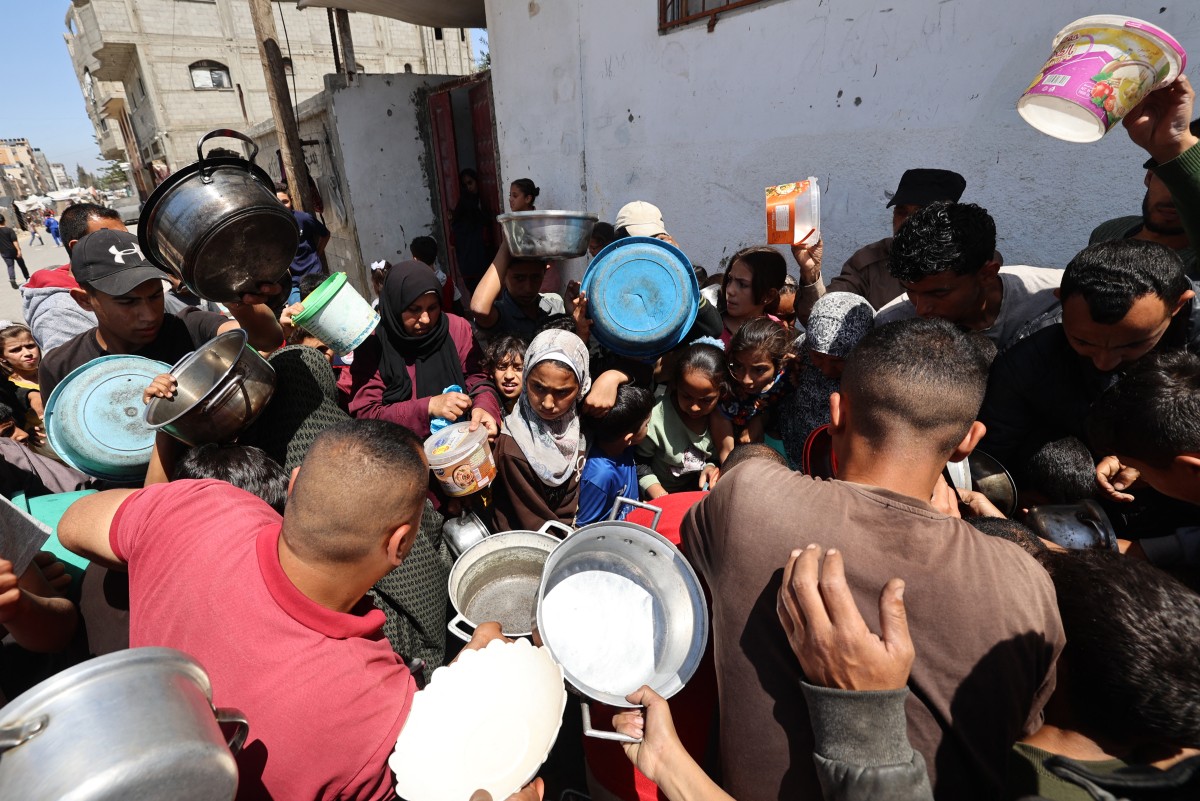 فلسطينيون يقفون في طابور لتلقي حصص غذائية من مطبخ خيري في مخيم البريج للاجئين في وسط قطاع غزة (أ ف ب).