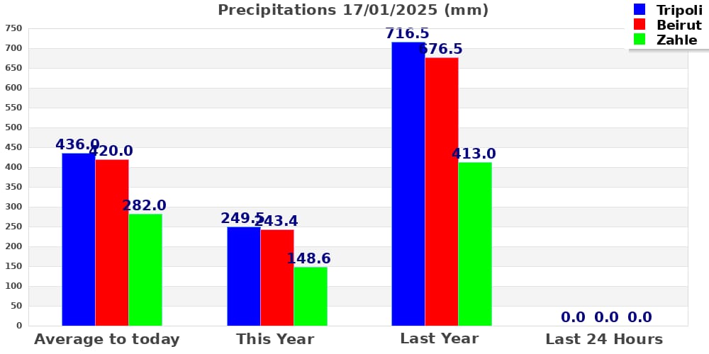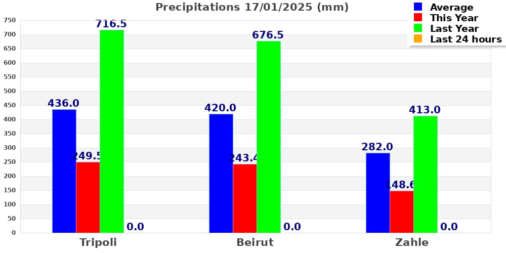 تظهر البيانات وخرائط الرصد التابعة لمصلحة الأرصاد الجوية في لبنان، تراجعاً في كمية الأمطار مقارنة بنفس الفترة مع السنوات الماضية في طرابلس وزحلة وبيروت.