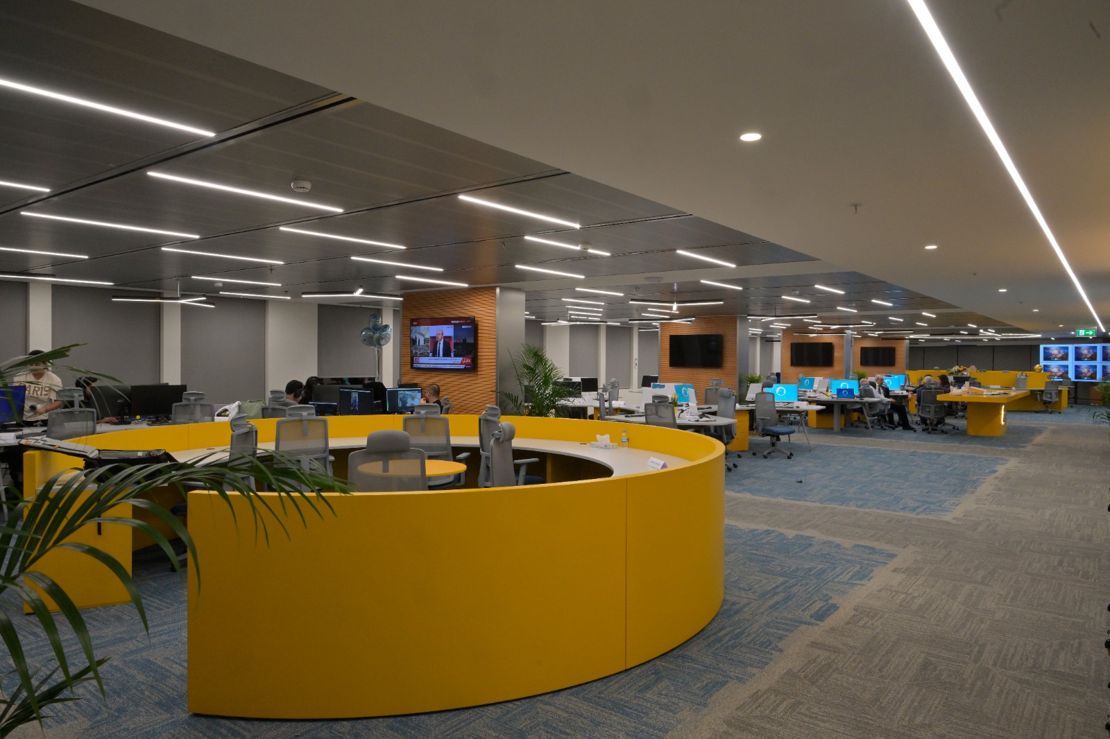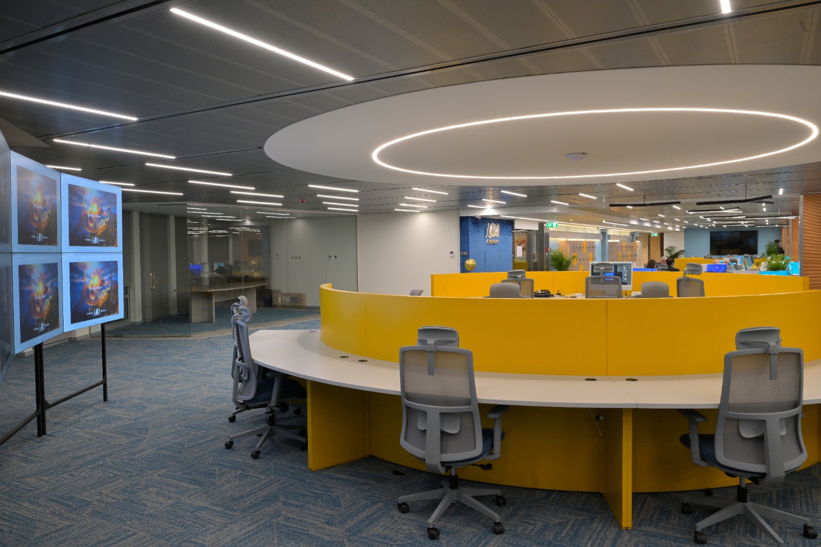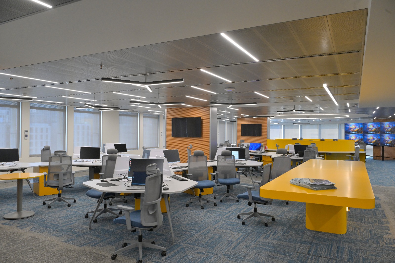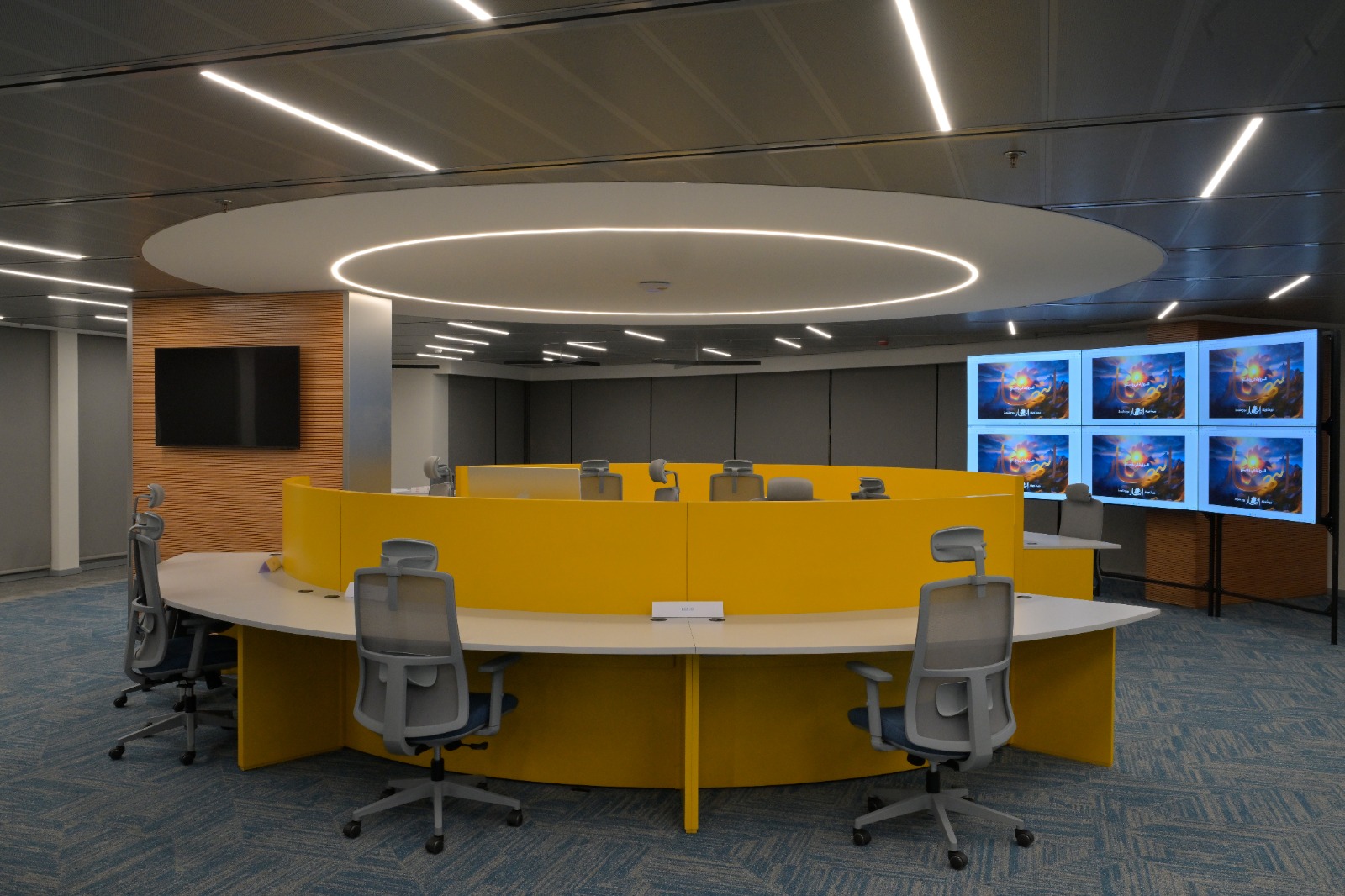 * شاشات متطورة وجدار فيديو يعرض محتوى إخبارياً مع تحليلاتلحظية.