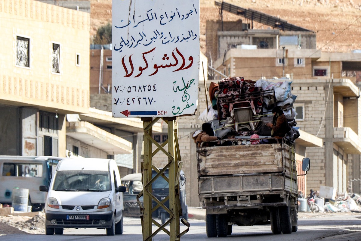 شاحنة محملة بأمتعة لاجئين سوريين انطلقت من مخيم في عرسال شرق لبنان في طريق العودة إلى سوريا (16 ك1 2024، أ ف ب).