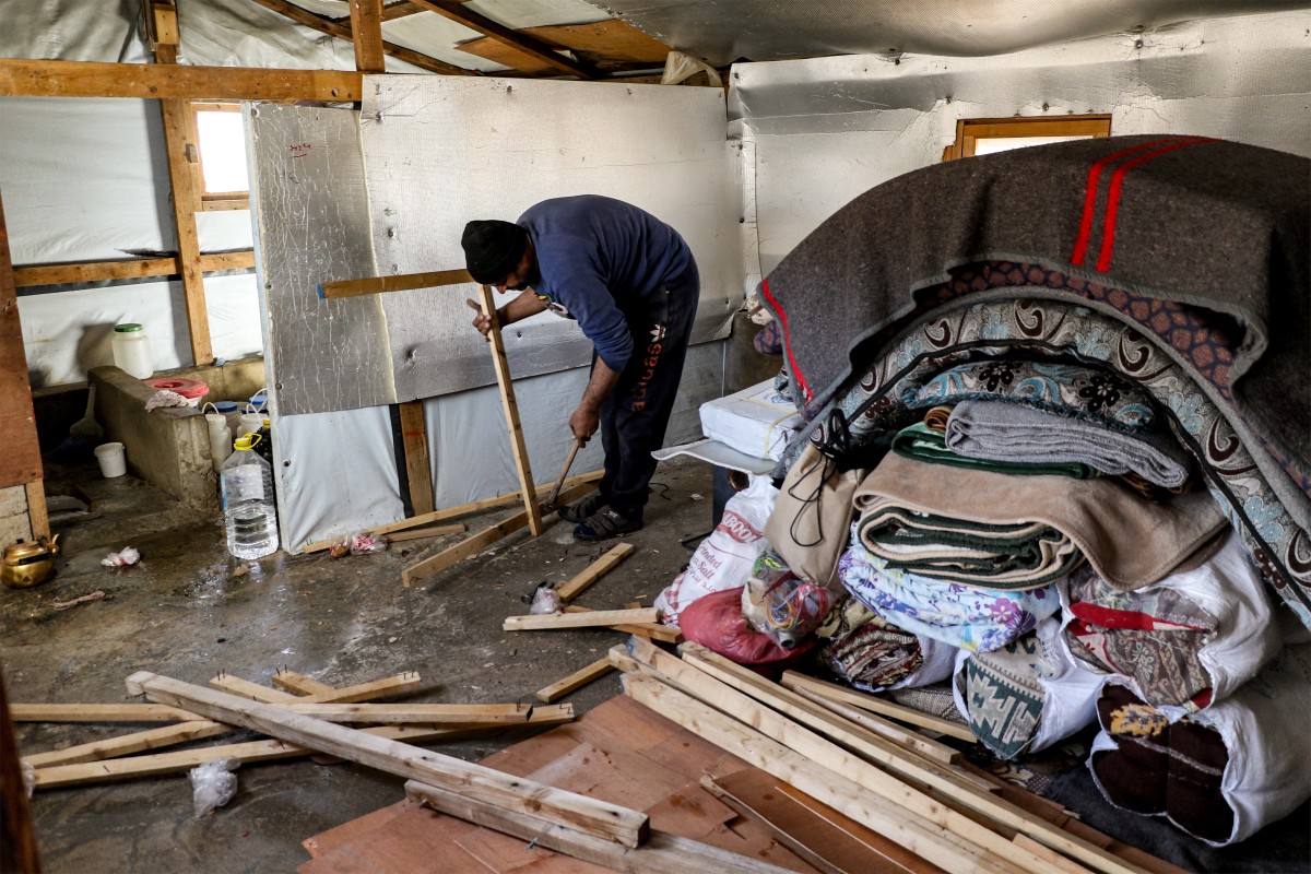 لاجئ سوري يستعد لتفكيك خيمته في مخيم بعرسال قبل العودة إلى سوريا (16 ك1 2024، أ ف ب).
