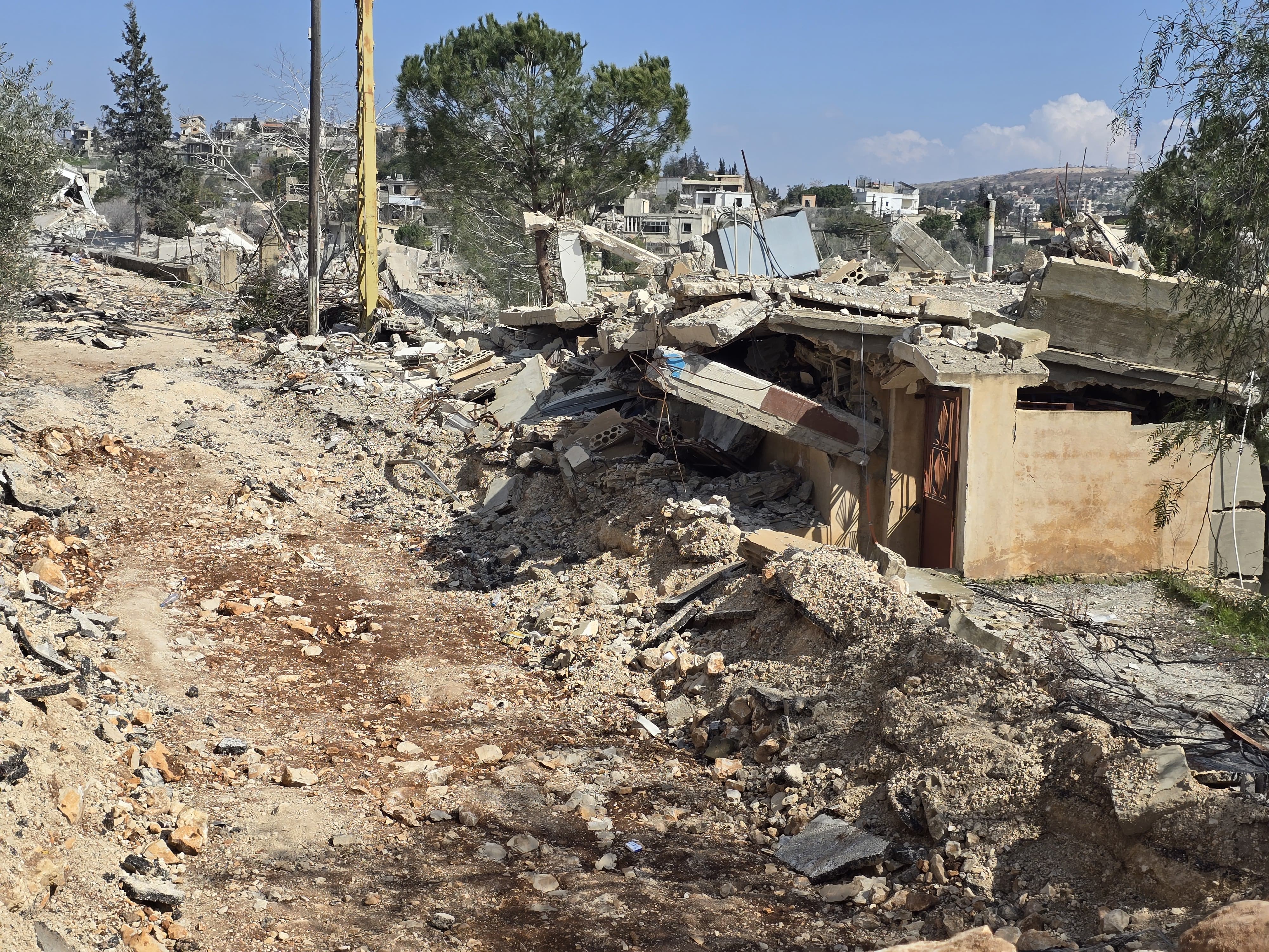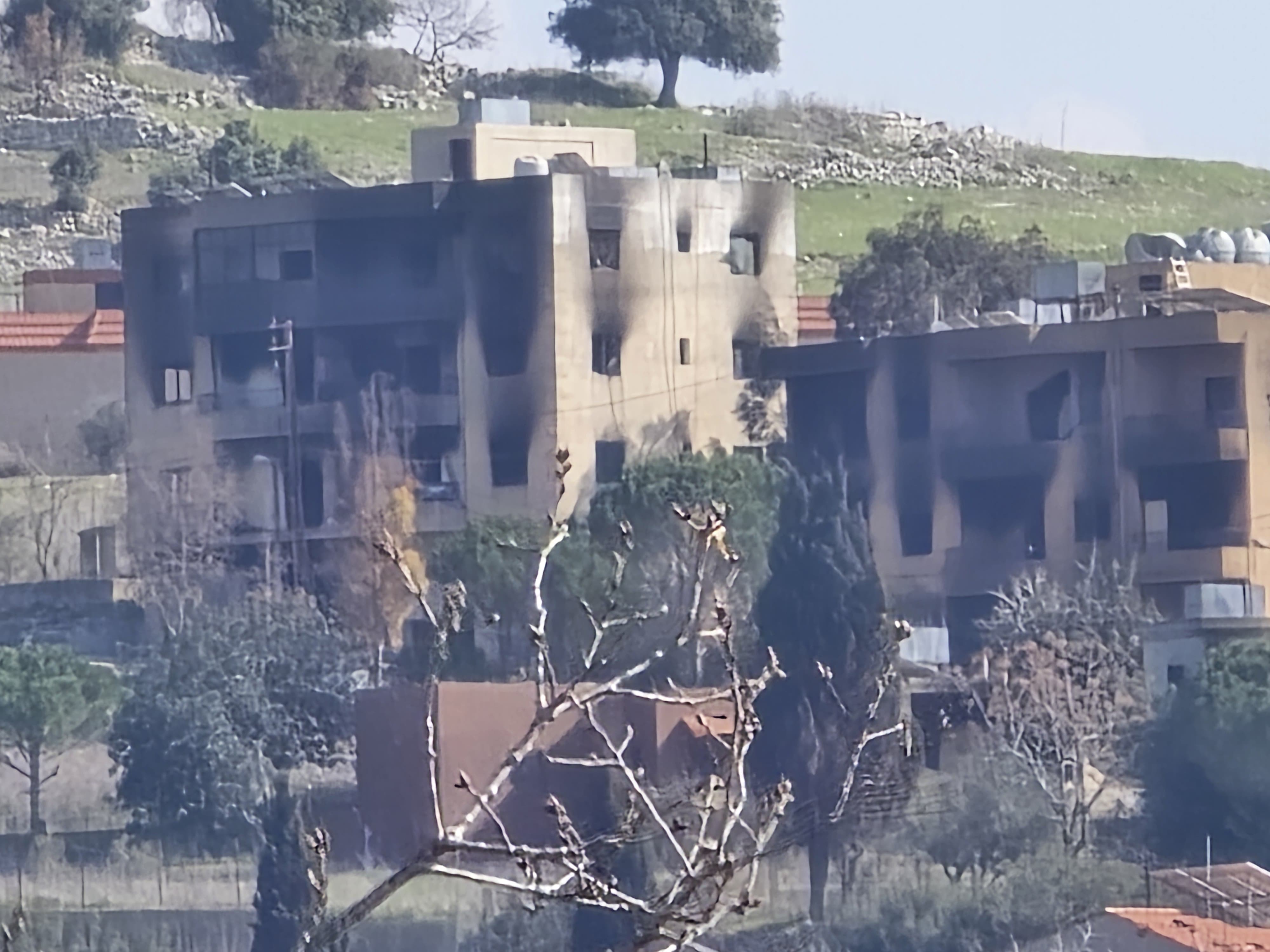 من آخر نقطة يتمركز فيها الجيش اللبناني عند المدخل الغربي للبلدة، حيث رفعت قوات الاحتلال سواتر ترابية أقفلت فيها كل المداخل الرئيسية والفرعية، باستثناء المدخل الشرقي من جهة موقع العباد، يمكن بالعين المجردة رؤية العديد من المنازل والأبنية المدمرة أو المحروقة، وسط البلدة وعند أطرافها وصولاً الى موقع العباد وموقع آخر لجهة مستوطنة المنارة المطلة على بلدة ميس الجبل والطرف الجنوبي لحولا التي انسحبت منها قوات الاحتلال صباح اليوم الثلاثاء، وانتشر الجيش اللبناني فيها وسمح بدخول الأهالي الذين أصروا على إعادة بنائها من جديد.