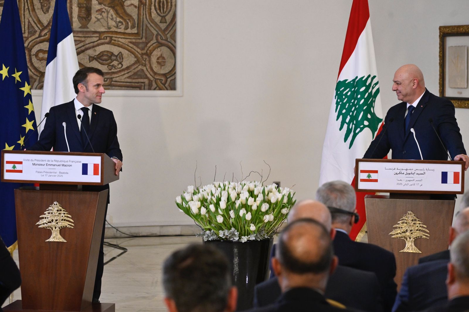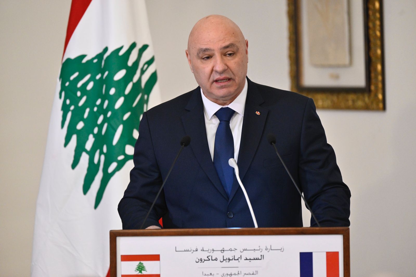 بدوره، اكد الرئيس الفرنسي ايمانويل ماكرون على أن "فرنسا التي كانت الى جانب لبنان ملتزمة بالبقاء الى جانب اللبنانيات واللبنانيين، لكي تساعد رئيس الجمهورية في النجاح على الطريق الذي يسير عليه. فإن ما يجسده ضروري، كونه طريقا جديدا وعهدا جديدا".