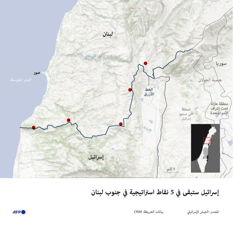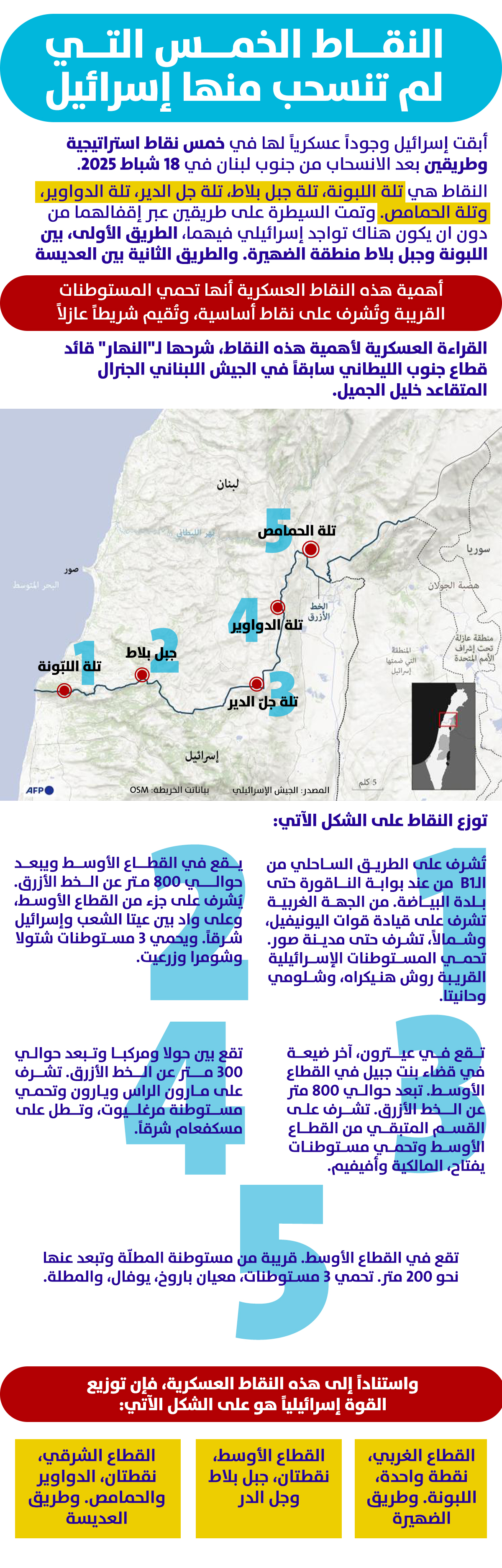 أبقت إسرائيل وجوداً عسكرياً لها في خمس نقاط استراتيجية وطريقين بعد الانسحاب من جنوب لبنان في 18 شباط 2025.