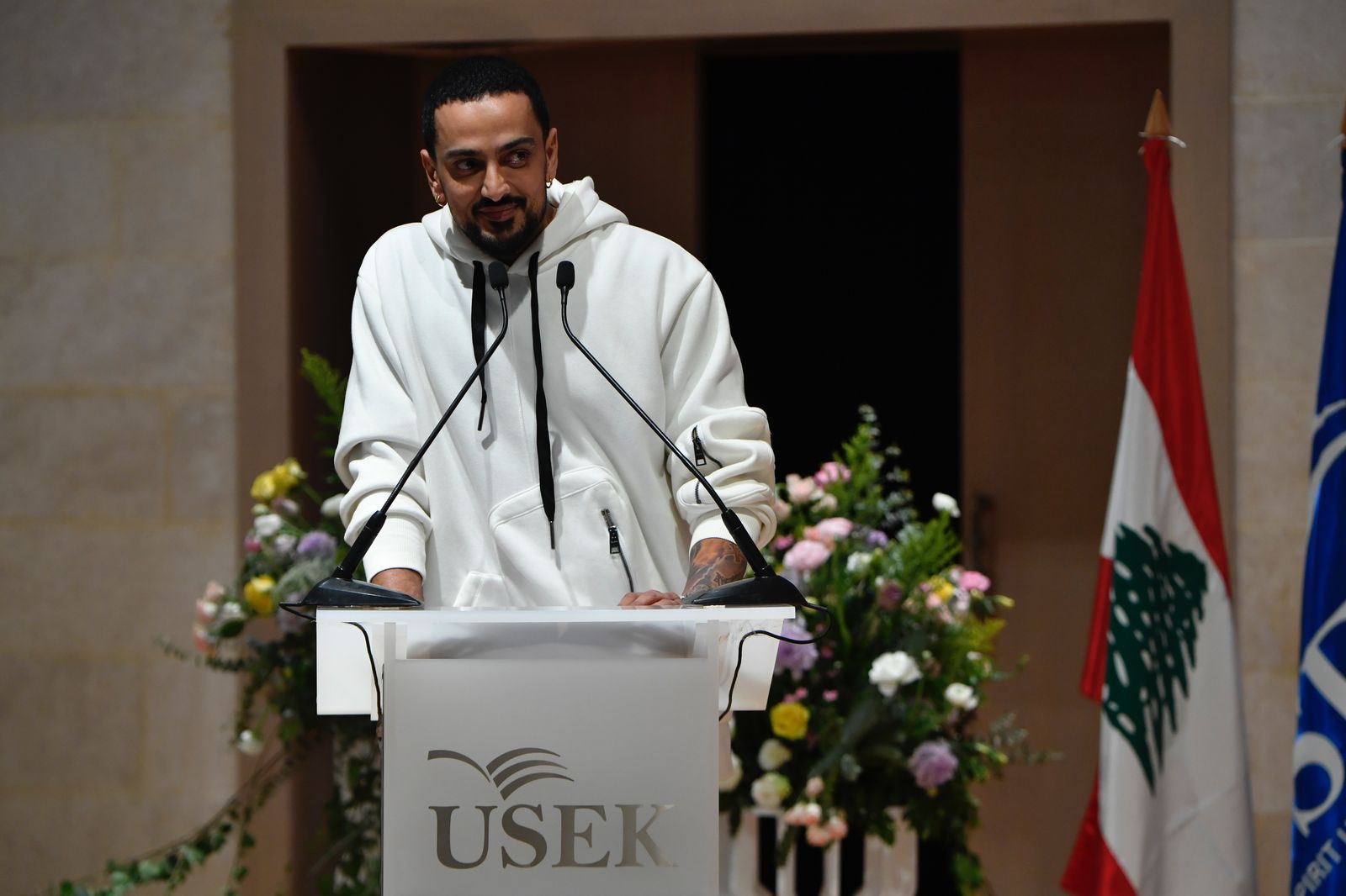 جرى الحفل في حضور وزيرة الشؤون الاجتماعية حنين السيد، النائب أنطوان حبشي، رئيس الجامعة الأب طلال هاشم وأعضاء مجلسها، إضافة إلى حشد من الشخصيات السياسية والعسكرية والتربوية والثقافية والإعلامية والاجتماعية، من بينهم رئيسة مجموعة "النهار" الإعلامية نايلة تويني، في قاعة البابا يوحنا بولس الثاني في حرم الجامعة في الكسليك.