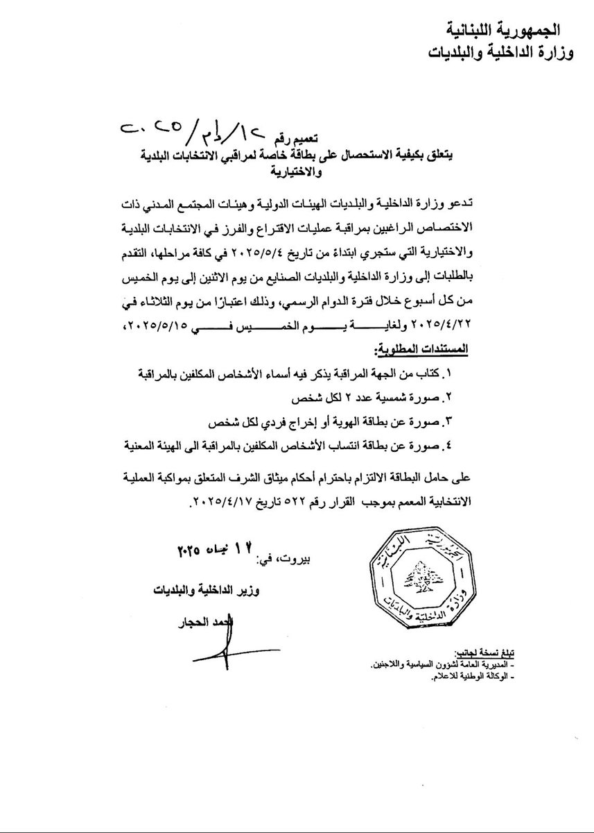 صدر عن وزارة الداخلية تعميم حول كيفية الاستحصال على بطاقة خاصة لمراقبي الانتخابات البلدية والاختيارية.