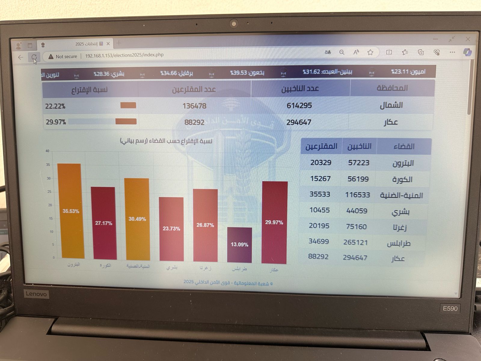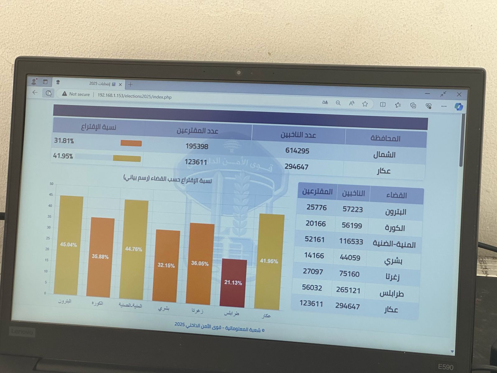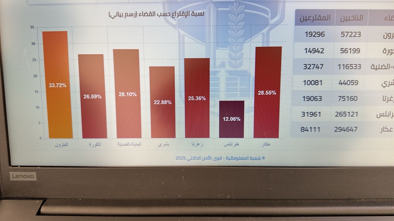 وزارة الداخلية: ارتفاع نسبة الاقتراع في الشمال إلى 14.17 %، وفي عكار إلى 21% وتوزّعت على الشكل التالي: طرابلس: 7.75% زغرتا: 16.69% بشري: 14.94% المنية - الضنية: 20.36% الكورة: 17.62% البترون: 24.07%