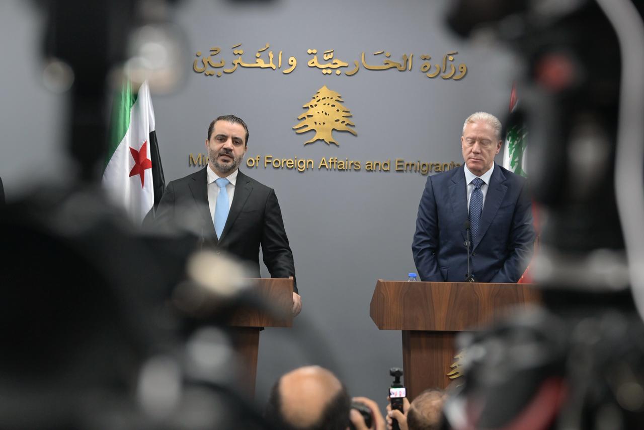 بعد اللقاء، عُقد مؤتمر صحافي مشترك بين الوزيرين، ابتدأه الوزير رجي بالترحيب الحار بالوزير الشيباني، معتبراً أن "هذه الزيارة التاريخية للبنان تعد بداية صفحة جديدة في العلاقات بين البلدين، بعد سقوط النظام السابق الذي عانى منه الشعبان السوري واللبناني طويلاً"، لافتاً إلى أن "هذه الزيارة تأخرت لأسباب تقنية ولوجستية، لكنها اليوم تأتي في توقيت مناسب، ونتطلع لأن تكون فاتحة خير على البلدين".