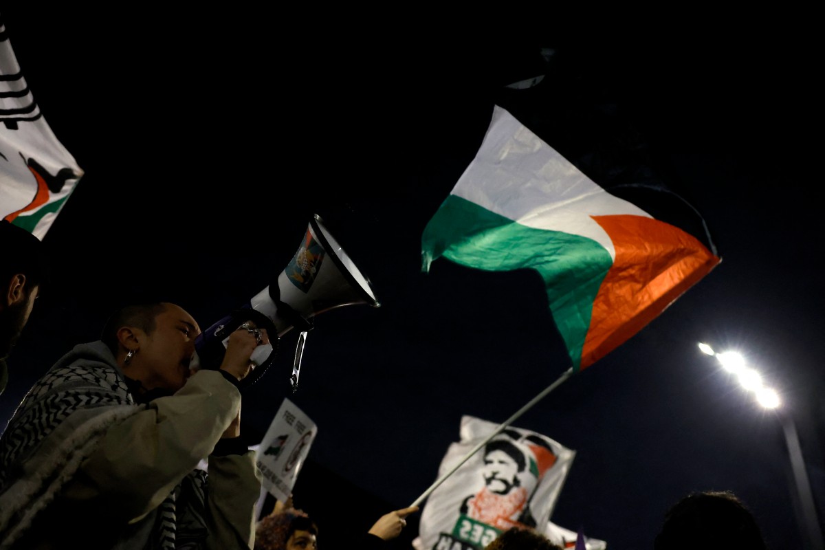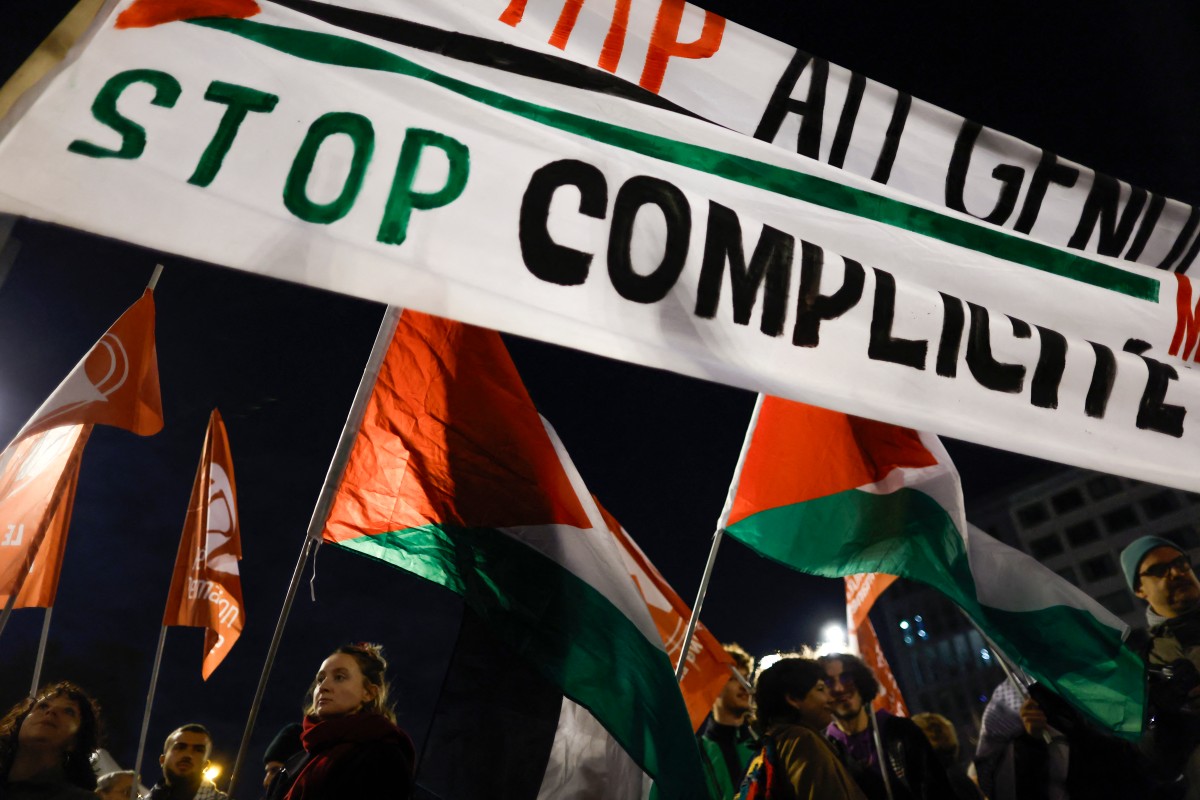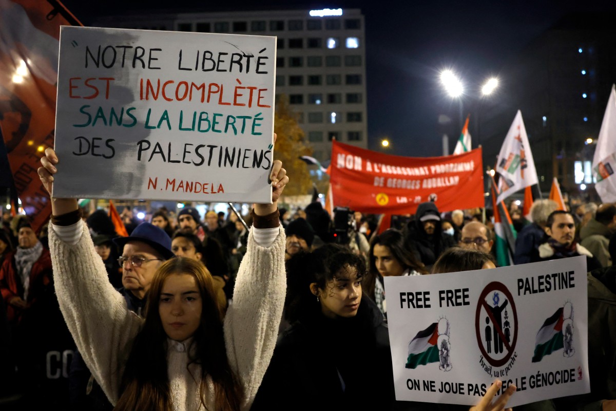 وقفة معارضة لإقامة مباراة فرنسا وإسرائيل ينفذها متظاهرون يحملون أعلام فلسطين في أوبيرفيلييه، في الضواحي الشمالية لباريس.