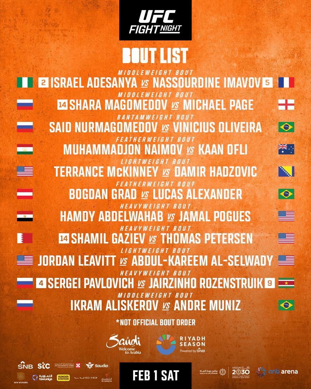 وكان قد أعلن عن النزال الرئيسي الذي سيجمع بين البطل السابق في وزن الوسط النجم النيجيري المولد والنيوزيلندي الجنسية إسرائيل أديسانيا (24-4-0)، المعروف بلقب "ذا لاست ستايل بندر" والنجم الصاعد نصر الدين إماموف (15-4-0)، المصنف الرابع عالمياً.
