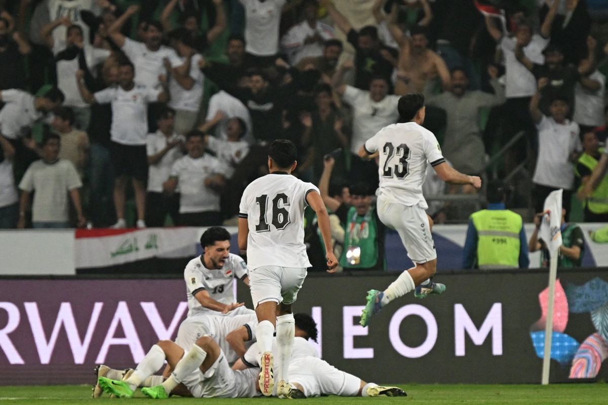 احتفال لاعبي العراق بتسجيل هدف التعادل (أ ف ب)