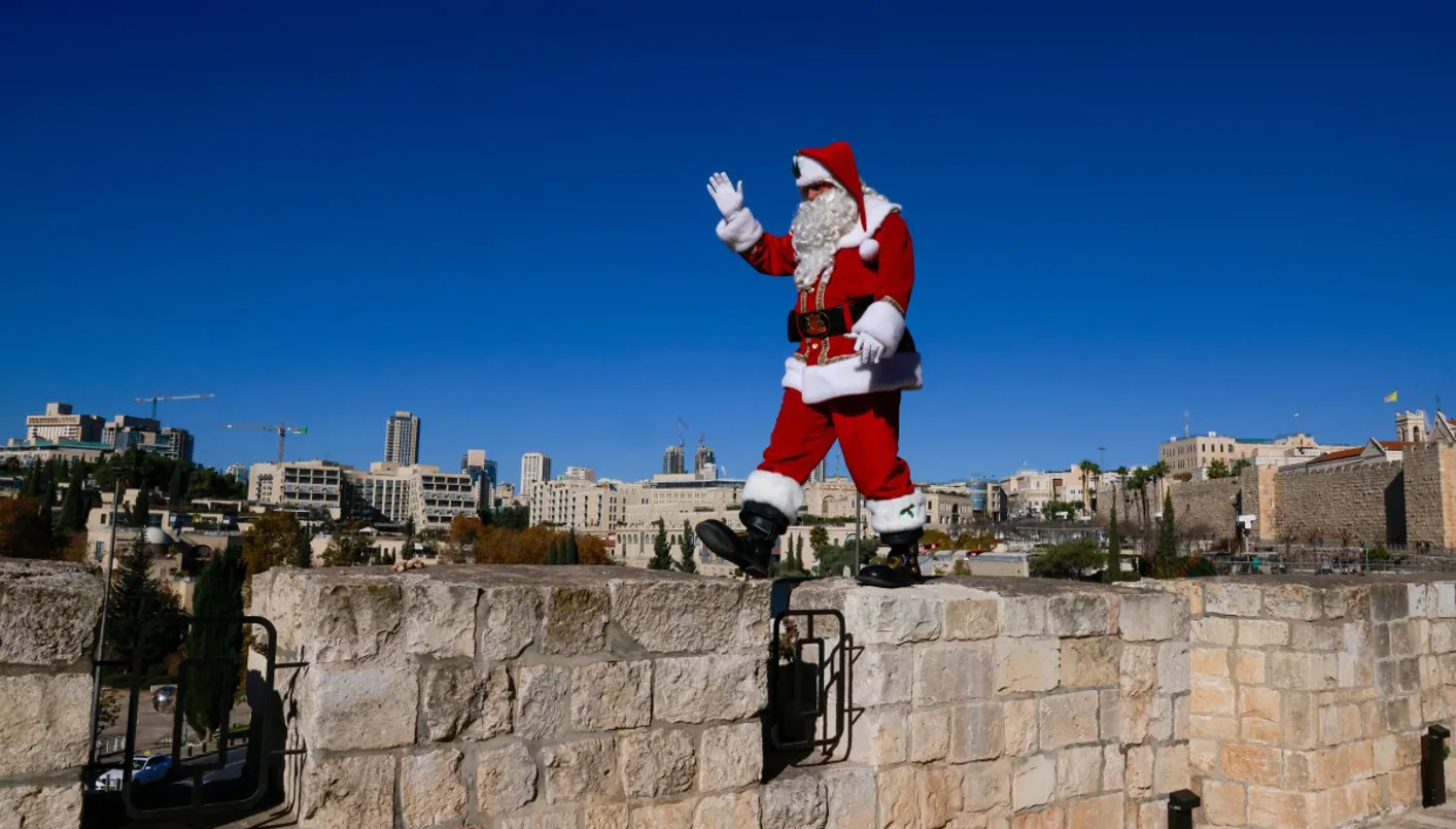 فلسطيني متنكر بزي بابا نويل عند بوابة الخليل في القدس.