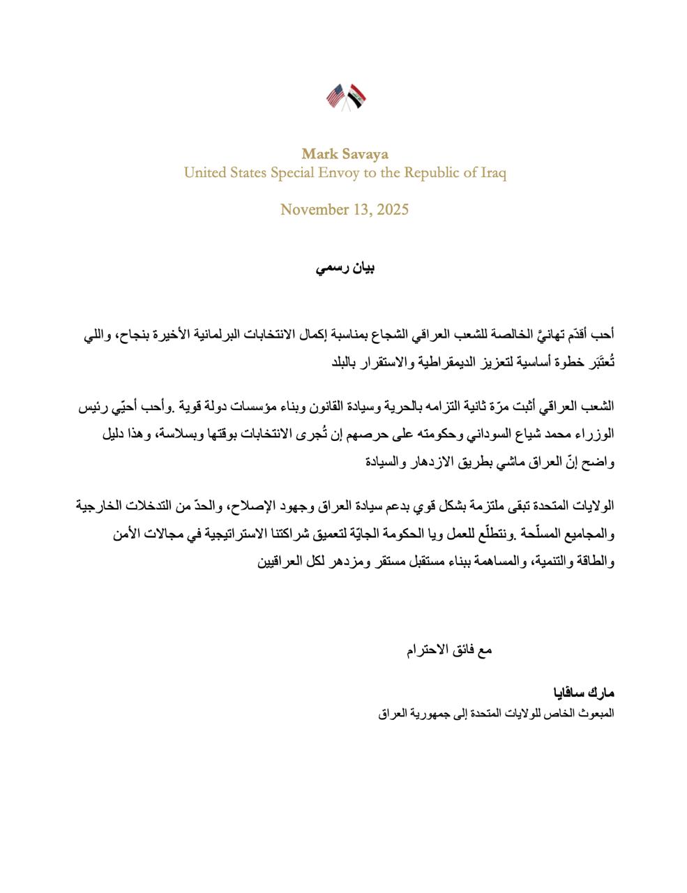 هنّأ المبعوث الأميركي الخاص إلى العراق، مارك سفايا، الشعب العراقي على  إتمام الانتخابات البرلمانية الأخيرة بنجاح، معتبراً أنّ هذا الحدث يشكّل "خطوة أساسية لتعزيز الديمقراطية والاستقرار في البلاد".