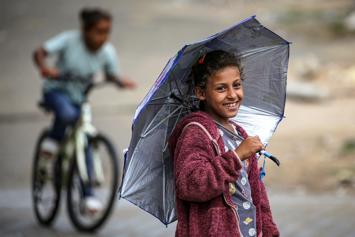 طفلة فلسطينية تحمل مظلة في مخيم البريج للاجئين وسط قطاع غزة (ا ف ب)