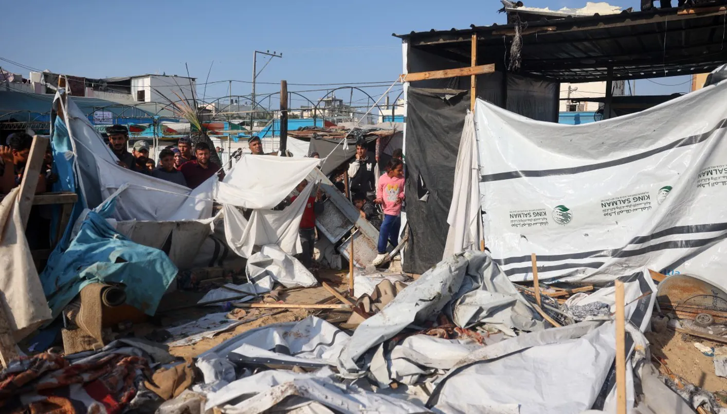 نازحون فلسطينيون يتفقدون أضرار غارة أصابت خيامهم في دير البلح (أ ف ب)