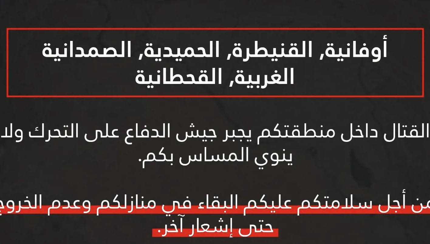 ووجّه أدرعي تحذيراً إلى السكان في جنوب سوريا في القرى والبلدات التالية:أوفانية، القنيطرةالحميدية، الصمدانية، الغربية، القحطانية، معلناً أنّ "القتال داخل منطقتكم يجبر الجيش الإسرائيلي على التحرك ولا ننوي المساس بكم.من أجل سلامتكم عليكم البقاء في منازلكم وعدم الخروج حتى إشعار آخر".