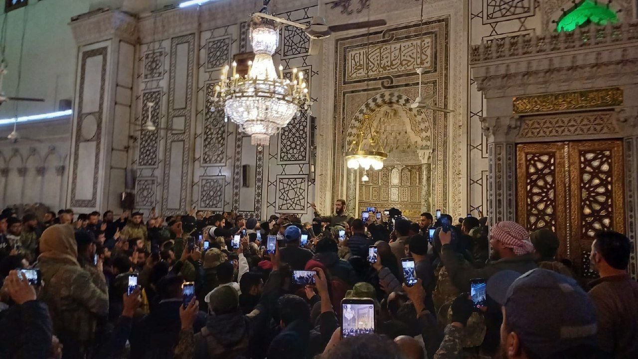 وانتشر مقطع فيديو للحظة دخول الجولاني إلى باحة المسجد الأموي ومحيط سوق الحميدية التاريخي والشهير في دمشق، محاطاً بمجموعة مسلّحة، وسط صيحات الحاضرين المرحّبة بوصوله إلى دمشق بعد سقوطها ورحيل الأسد.